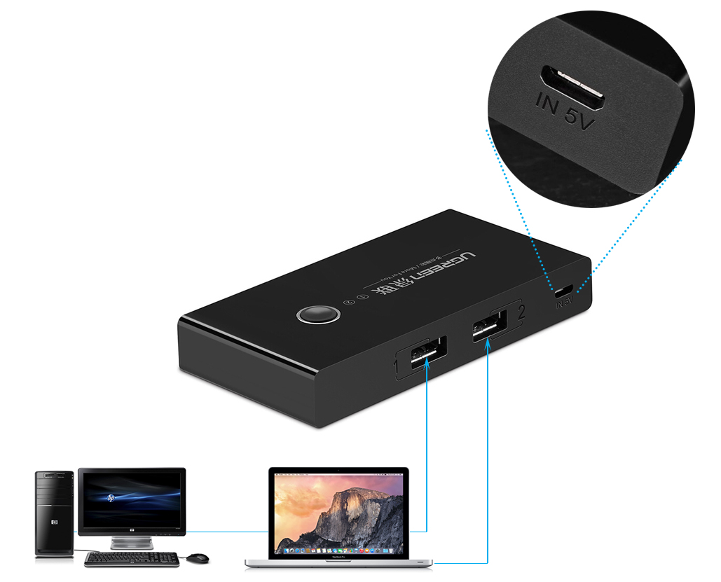 1. Input: USB-A Male x 2 for computer(One computer has access at a time); 2. Output: USB-A Port x 3 for USB device; 3. Speed up to 480Mbps *Support: Copy files from Computer A to