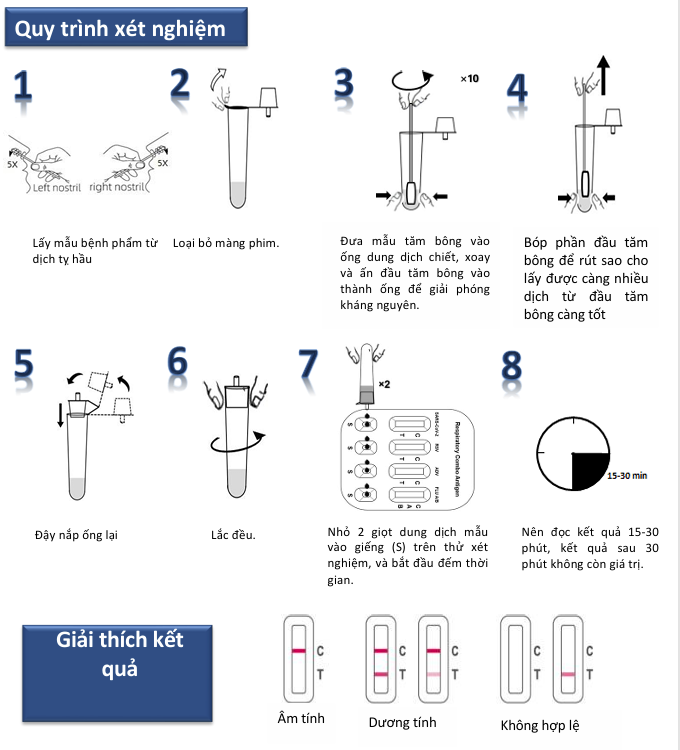 - Hướng dẫn (pcs) Công dụng Respiratory Combo Antigen Rapid Test là xét nghiệm miễn dịch dòng chảy bên nhằm mục đích phát hiện và phân biệt định tính đồng thời, nhanh chóng kháng nguyên nucleocapsid trong chẩn đoán in vitro thông qua hội chứng hô hấp cấp tính nặng do coronavirus 2 (SARS-CoV-2), vi rút cúm A, vi rút cúm B, vi rút hợp bào hô hấp (RSV) và Adenovirus (ADV) trực tiếp từ các mẫu bệnh phẩm dịch tỵ hầu được lấy từ các cá nhân bị nghi ngờ nhiễm vi rút đường hô hấp bởi nhà cung cấp dịch vụ chăm sóc sức khỏe, trong vòng bảy ngày đầu tiên kể từ khi các triệu chứng khởi phát. Đối tượng : Bệnh nhân Cách Chuẩn bị xét nghiệm Trước khi xét nghiệm, mở gói và cân bằng thẻ xét nghiệm, dung dịch chiết và mẫu thử ở nhiệt độ phòng, đồng thời lắc nhẹ dung dịch chiết trước khi . Điều kiện nhiệt độ thích hợp nhất để thực hiện thử nghiệm là nhiệt độ phòng (15 ~ 30 oC). Nếu bộ xét nghiệm được bảo quản ở nhiệt độ phòng thì có thể mở ra và ngay. Quy trình xét nghiệm