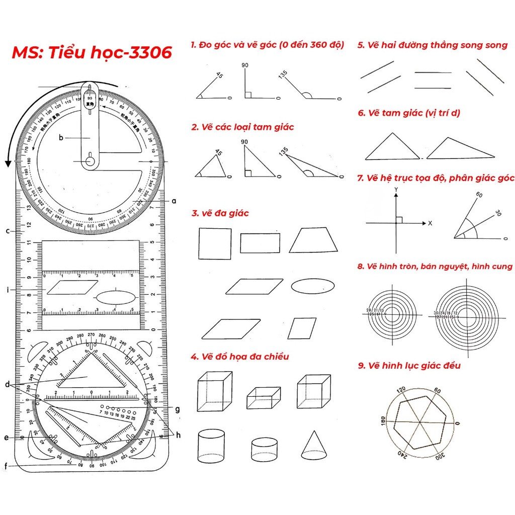 Thước đa năng vẽ được hình tròn, hình chữ nhật và hình tam giác, cũng vẽ xi lanh, hình nón, khối, bộ phận nâng, đường dọc, v.v.