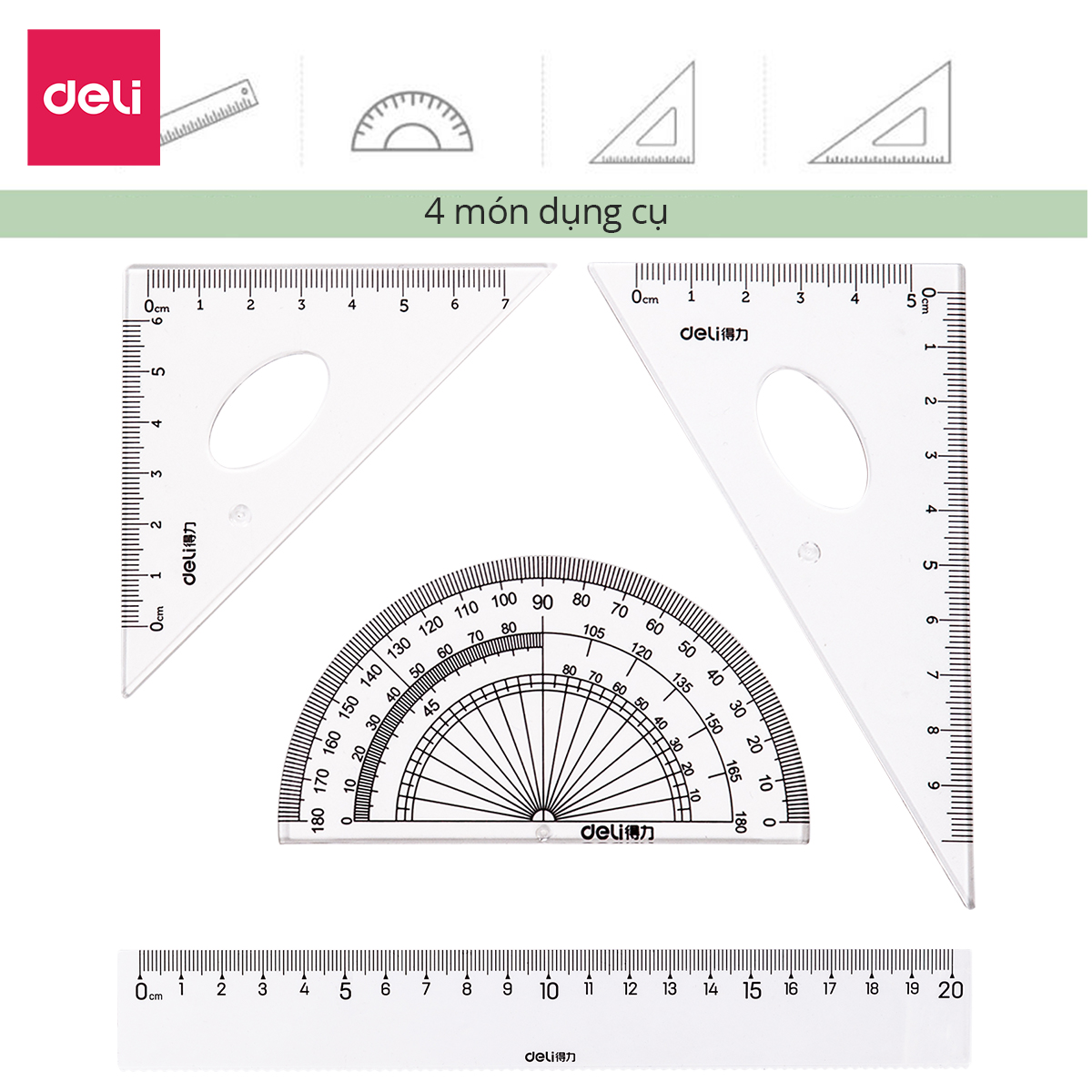 Bộ bốn cây thước kẻ, thước đo độ, eke dành cho học sinh Chất liệu: Nhựa Bao gồm: Thước thẳng 15cm, thước eke 45 độ, thước eke 60 độ, thước đo góc 180 độ Là
