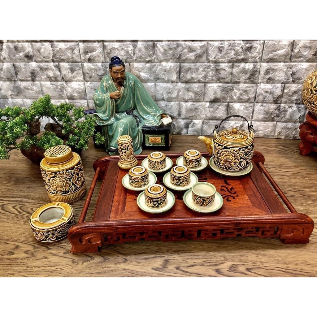 Bộ ấm trà gốm đắp tay khay chữ nhật 29 x 19cm - chuẩn loại 1 Bát Tràng + Chất liệu đất tử sa cao cấp + Sản xuất tại Bát Tràng + Bộ gồm