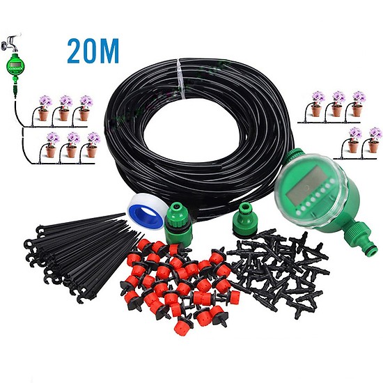 Bộ tưới cây tự động 20 béc nhỏ giọt kèm van nước hẹn giờ là 1 hệ thống tưới nhỏ giọt đơn giản nhưng đầy đủ và dễ sử dụng. Nó được thiết kế để đáp ứng nhu cầu tưới nhỏ giọt cho vườn nhỏ ( dưới 20 chậu ) của bạn. Hệ thống tưới nhỏ giọt đơn giản bao gồm tất cả các phần cần thiết cho 1 hệ thống tưới nhỏ giọt có thể dễ dàng lắp ráp bằng cách riêng của bạn mà không cần bất kỳ công cụ đặc biệt. Bạn chỉ phải bận rộn 1 lần, sau đó là chuỗi ngày tưới cây nhàn nhã thư thả. Hệ thống tưới bao gồm cả đồng hồ hẹn giờ tự động, bạn có thể kết nối với nguồn nước máy áp lực khỏe tương đối hoặc téc nước từ trên cao (>2m) hoặc bơm tăng áp tự động là hệ thống có thể hoạt động. Các tính năng:  Bộ nhỏ giọt có thể được kết nối trực tiếp với vòi có ren (vòi máy giặt hoặc đầu ống nhựa PVC), rất tiện lợi và thiết thực.  Cắt vòi, thích nghi với điều kiện cố định cục bộ, phù hợp hơn.  Nắp màu đỏ của đầu thả có thể điều chỉnh được xoắn thành dạng nhỏ giọt và hình dạng được đóng lại. Đáp ứng nhu cầu của bạn.  Khi bạn có thể chỉ cần tắt các bộ phát riêng lẻ.  Khi bộ chuyển đổi vòi và nước của bạn mở, nó có thể được tưới tự động.