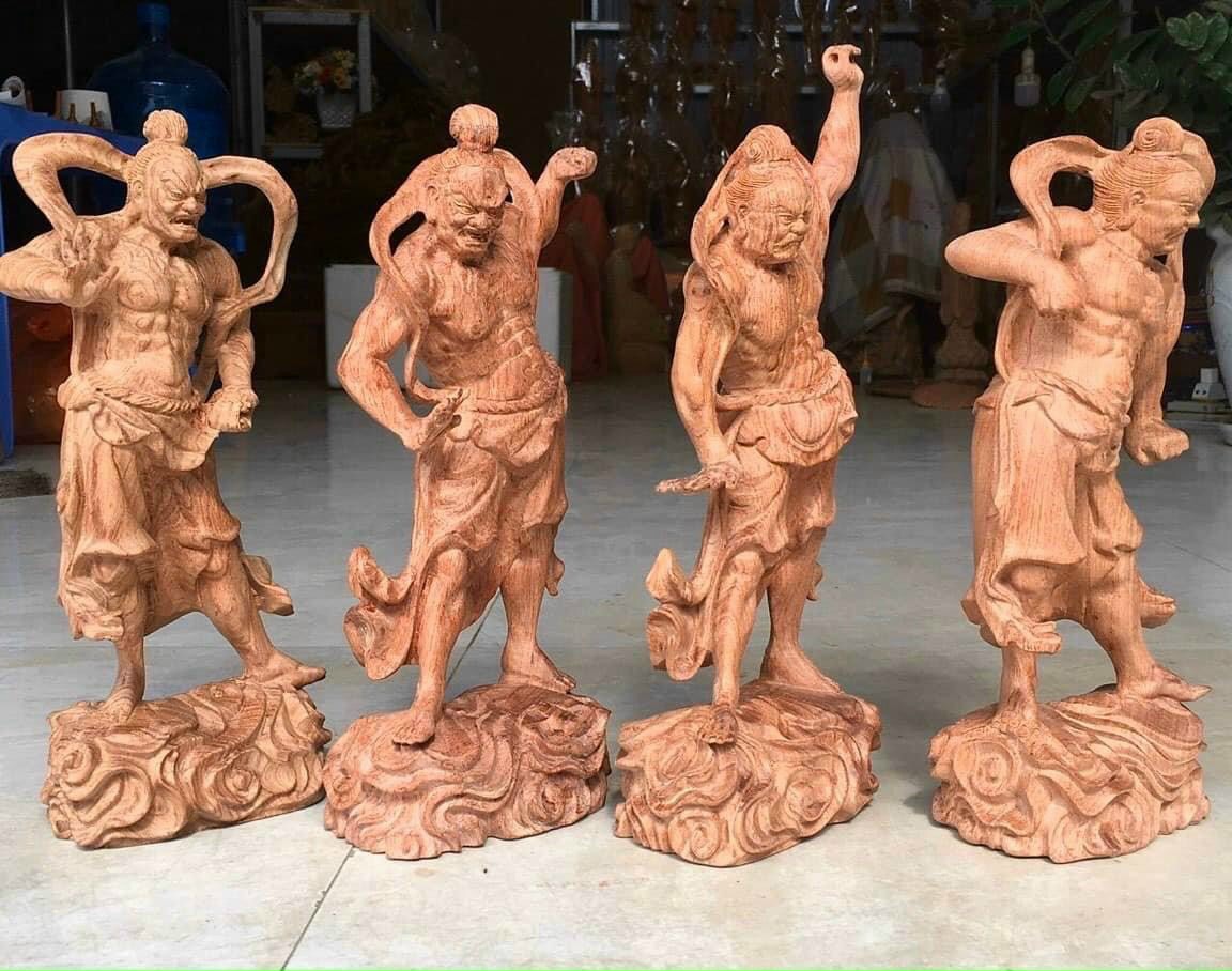 _ Bộ tượng tứ đại kim cương được  trạm khắc vô cùng tỉ mỉ tinh sảo kỳ công .Đi hầu hết tất cả mọi chi tiết góc ngách nội dung hoa văn của tượng đều được ngọt tỉa chỉnh sửa hoàn toàn bằng tay thủ công .Đồng thời tượng được kiểm định vô cùng khắt khe ,Như cho vào thẩm sấy cho gỗ khô kiệt .Mục đích trống dập nứt vênh mo mối mọt song cho vào trà nhám, cho sạch sẽ sờ mát lạnh song cho vào  ,phun lót làm bóng mờ để giữ lại mầu sắc vân gỗ tự nhiên ,Tượng được làm và hoàn thiện do bàn tay khối óc tài hoa ,Từ những người thợ giàu kinh nghiệm cũng như tay nghề cao trong làng nghề truyền thống .Tượng được làm và hoàn thiện do bàn tay khối óc tài hoa ,Từ những người thợ giàu kinh nghiệm cũng như tay nghề cao trong làng nghề truyền thống ,Chính  vì thế bộ tượng tứ đại kim cương đã đáp ứng đầy đủ những tiêu trí ( Đẹp bền rẻ ) Thẩm mỹ nghệ thuật với chất lượng tuyệt vời
