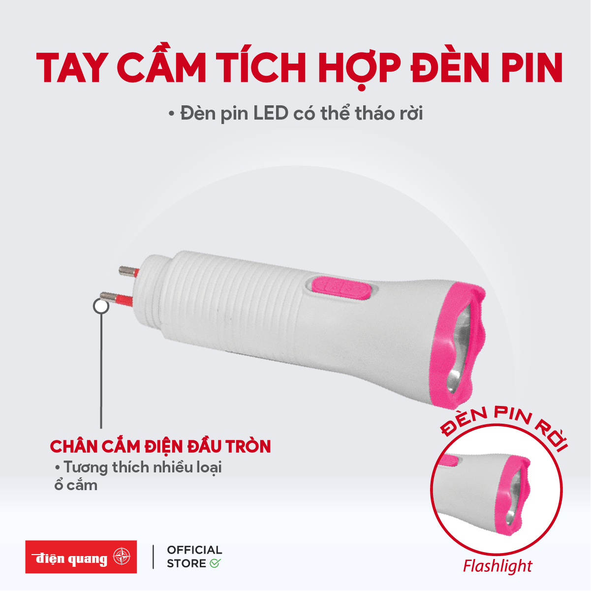- Bộ Vợt muỗi Điện Quang còn trang bị đèn pin chiếu sáng tiện lợi và tích hợp phích cắm ngay trên thân, dễ dàng đóng mở khi sạc pin.