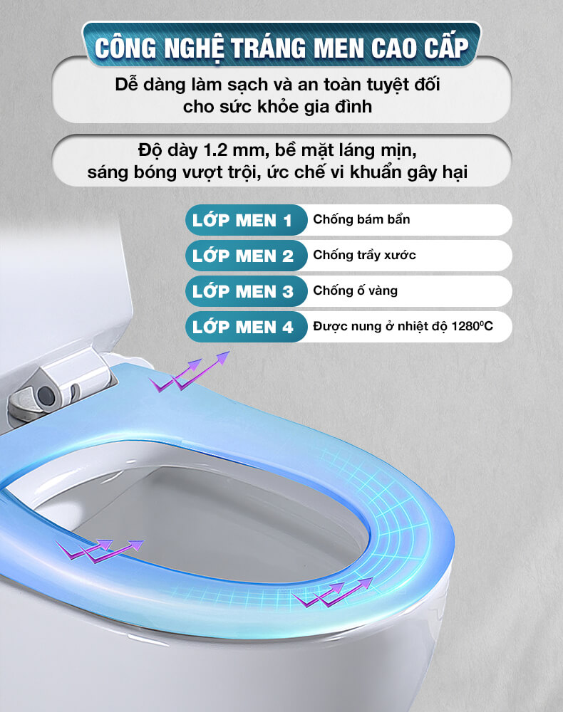 - Ứng dụng công nghệ trắng sáng đột phá, nước men sáng bóng, kháng khuẩn được phủ theo công nghệ hiện đại bền đẹp thách thức thời gian. Ngoài ra trong lòng bàn cầu còn được tráng lớp men chống bám bẩn giúp cho mọi vết bẩn được dễ dàng cuốn trôi đi. Không bị ố vàng và luôn luôn sáng bóng. Bảo hành phần chất liệu sứ, nắp bồn cầu và phụ kiện cho sản phẩm nếu có bất cứ lỗi nào do nhà sản xuất.
