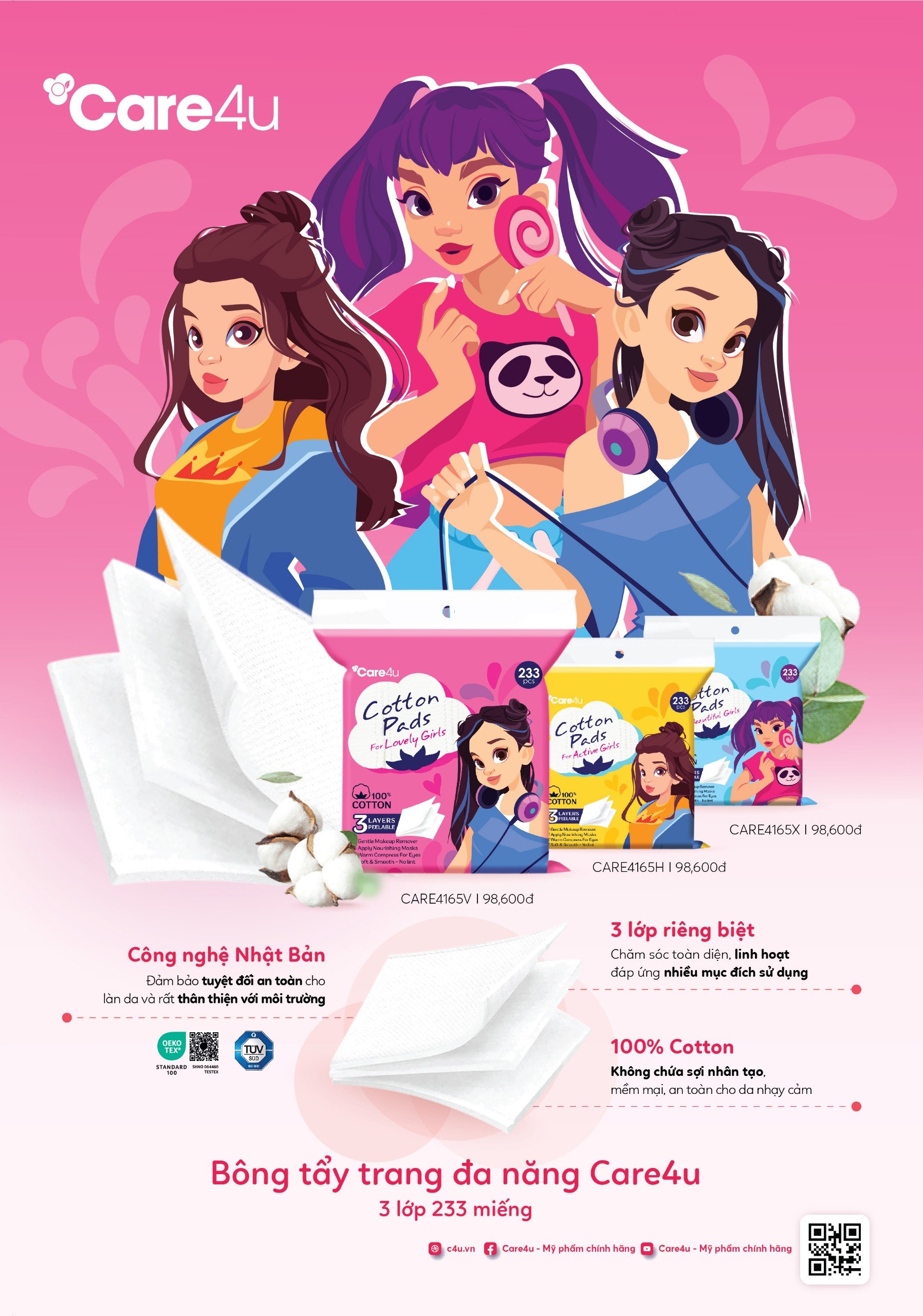 Bông tẩy trang cao cấp Care4u 3 lớp 233 miếng_CARE4165V