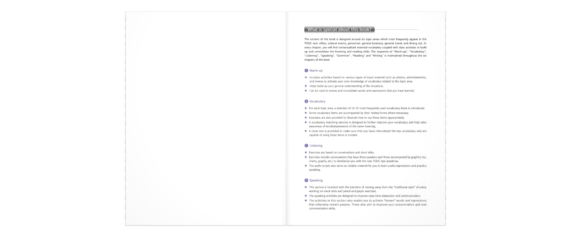 The content of this book is designed around six topic areas which most frequently appear in the TOEIC test: office, cultural events, personnel, general business, general travel, and dining out. In every chapter, you will find contextualized essential vocabulary coupled with class activities to build up and consolidate the listening and reading skills. The sequence of “Warm-up”, “Vocabulary”, “Listening”, “Speaking”, “Grammar”, “Reading” and “Writing” is maintained throughout the six chapters of the book.