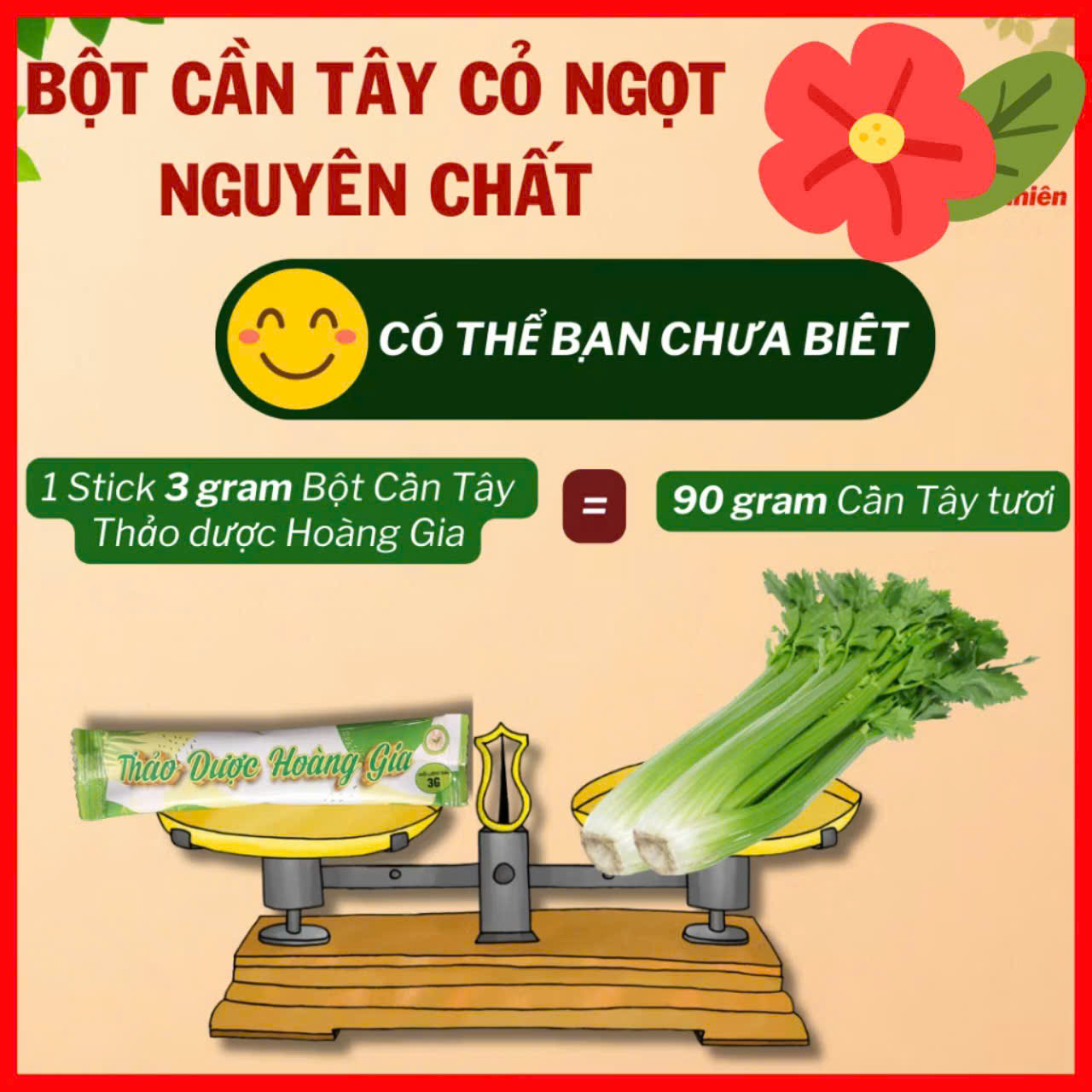 THÔNG TIN SẢN PHẨM Thành phần : Bột rau cần tây nguyên chất Ngày sản xuất xem trên bao bì Hạn sử dụng 12 tháng kể từ ngày sản xuất Trọng lượng: 50g Không sử