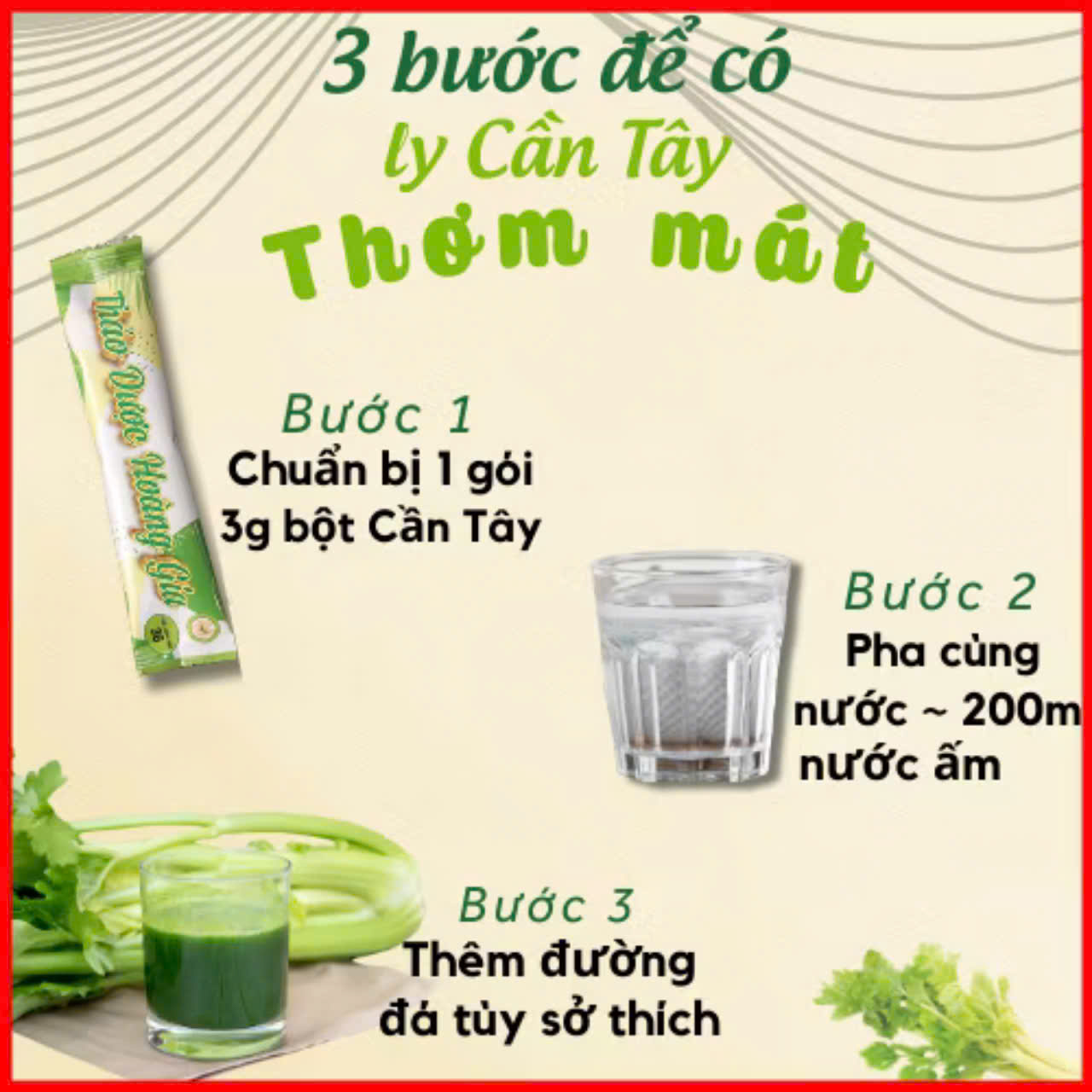 Sản phẩm nguyên chất 100% từ cần tây tươi, không chất bảo quản, không chất phụ gia. Sản phẩm được dùng thay thế cho cần tây tươi.