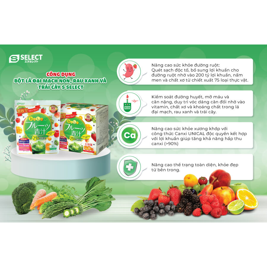 Mua tại TiktokBột lá đại mạch non, rau xanh và trái cây S Select Nhật Bản ( hộp 60 gói) giúp bổ sung chất xơ, vitamin từ 21 loại rau củ quả và chiết xuất của 75 loại thực vật giúp thải độc cơ thể, làm đẹp da, chống lão hóa. THÀNH PHẦN Maltodextrin, bột lá Đại mạch non (35,000%), chất tạo độ chua (acid citric), canxi (Calci carbonat), nấm men (Saccharomyces cerevisiae), hương liệu tổng hợp, bột rau xanh (1,666%), chất tạo ngọt tổng hợp (aspartam), bột chiết xuất thực vật lên men (0,333%), vi khuẩn sinh acid lactic (Enterococcus faecalis). CÔNG DỤNG BỘT LÁ ĐẠI MẠCH NON, RAU XANH VÀ TRÁI CÂY S SELECT giúp