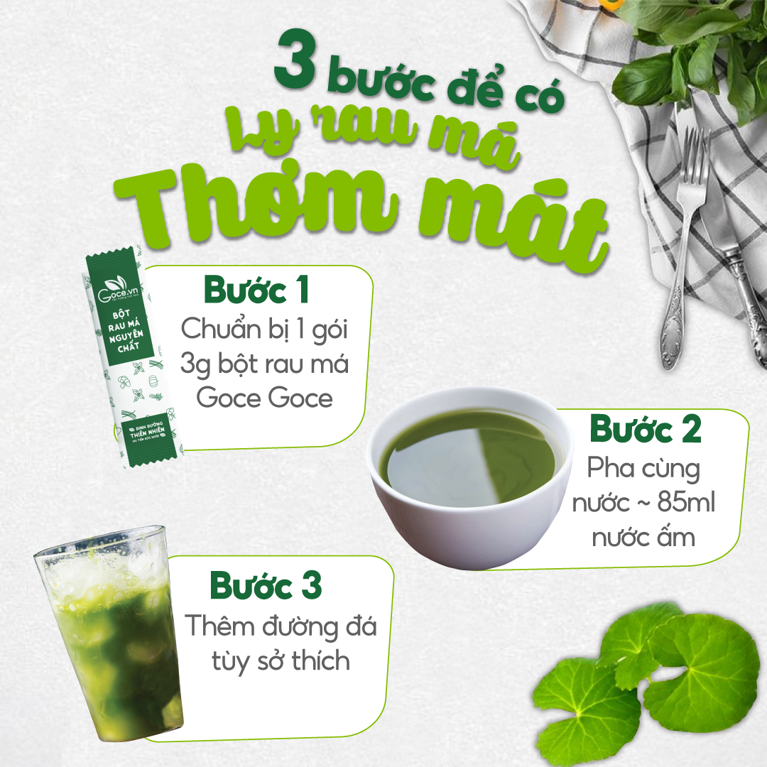 - Cho gói bột rau má (3g) vào 60ml - 85ml nước ấm (có thể gia giảm lượng nước theo ý thích). Khuấy đều và thưởng thức. Có thể cho thêm đường vào để dễ uống và ngon hơn.