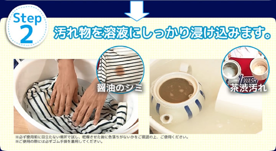 - Đối với những vật dụng bằng vải/ sợi như quần áo: sau khi hòa tan bột Oxi wash, thấm nhẹ dung dịch đã pha loãng lên bề mặt của vết bẩn sau đó vò nhẹ (lưu ý: cần phân loại các quần áo vải màu & vải trắng trước khi tẩy)