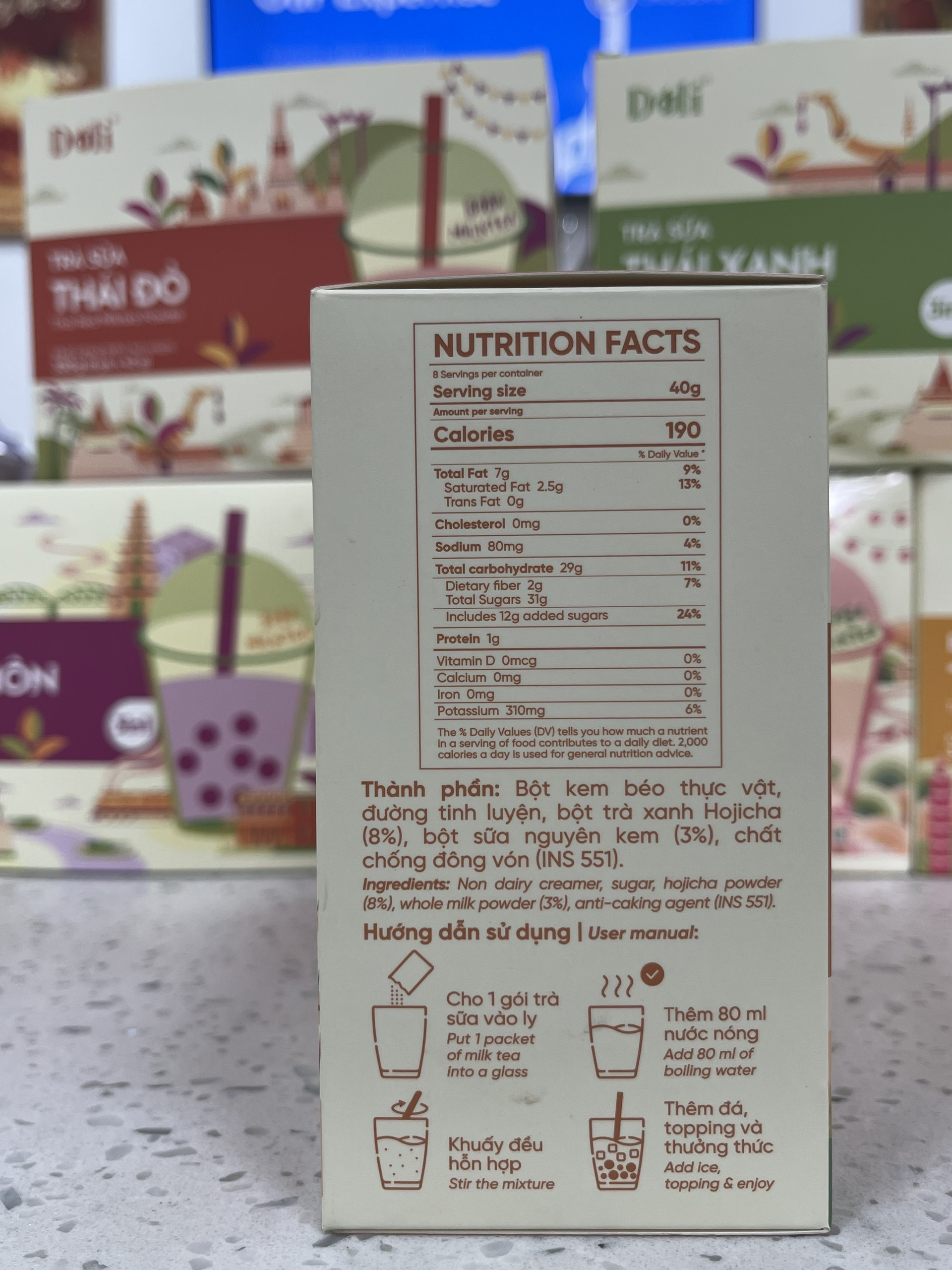 Với nhiều tín đồ trà sữa ai cũng hiểu một điều. Khi cơn thèm trà sữa đến là phải có trà sữa. Vậy nên những ngày đi học bận rộn, những ngày cuối tháng vơi tiền, hoặc trời mưa oái oăm không mua được trà sữa uống thì phải làm sao? Hiểu được nỗi lòng đó, Déli đã phát triển dòng bột trà sữa 3in1 với nhiều vị phổ biển hiện nay như trà sữa truyền thống, trà sữa matcha, trà sữa nướng , trà sữa khoai môn , trà sữa Thái xanh/ đỏ . Với cách pha vô cùng nhanh chóng và tiện lợi, giúp mọi người có thể tự pha trà sữa tại nhà , tại văn phòng,...bất kì lúc nào . Trọng lượng: Hộp 8 gói (40gr/gói) Ngày sản xuất: in trên bao bì. Hạn sử dụng: 18 tháng kể từ ngày sản xuất. Sản xuất : Việt Nam ️ Bảo quản: nơi khô ráo thoáng, tránh ánh sáng trực tiếp. Đóng kín miệng túi sau khi sử dụng. ️️ Hướng dẫn sử dụng:
