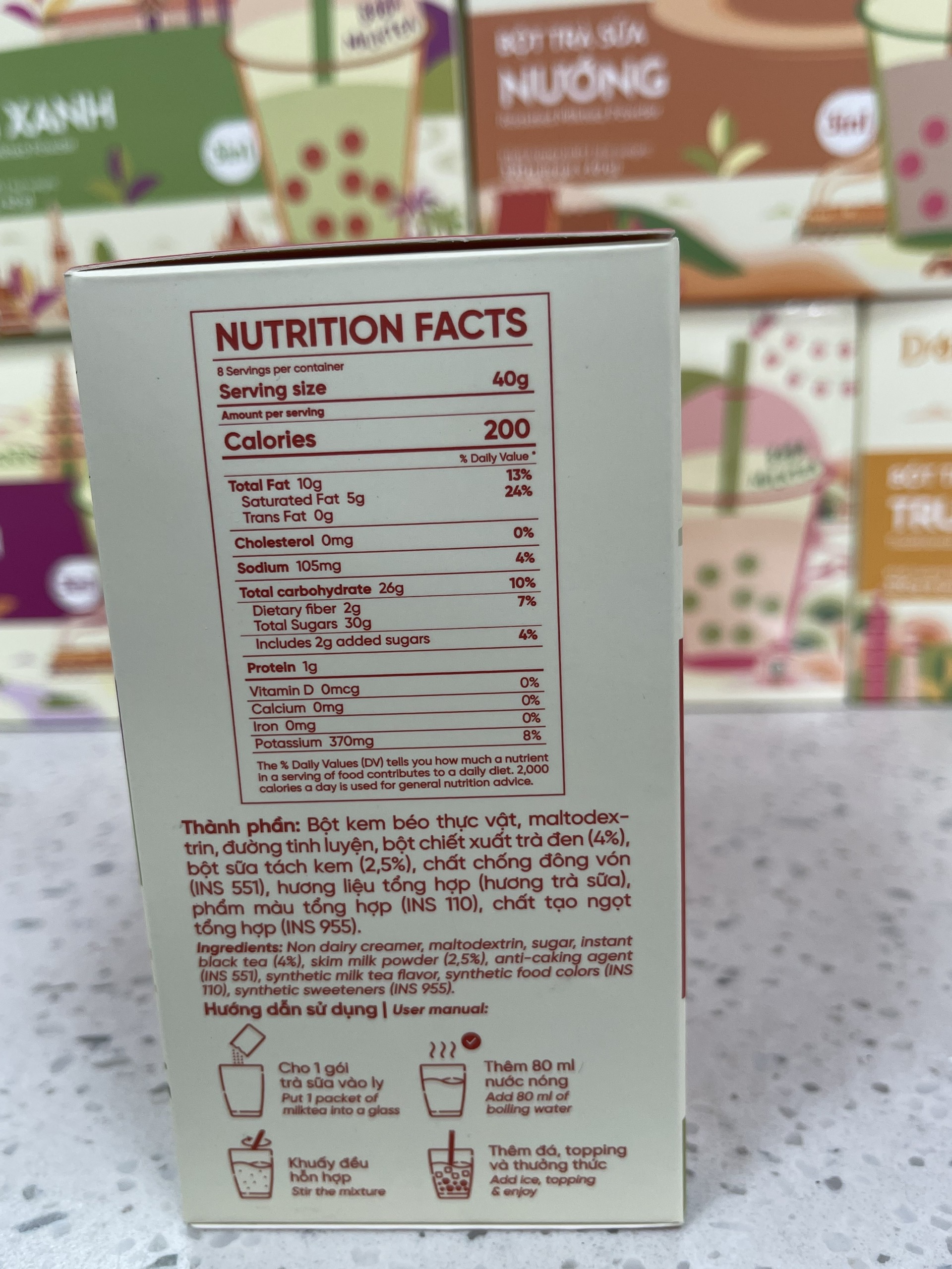 Với nhiều tín đồ trà sữa ai cũng hiểu một điều. Khi cơn thèm trà sữa đến là phải có trà sữa. Vậy nên những ngày đi học bận rộn, những ngày cuối tháng vơi tiền, hoặc trời mưa oái oăm không mua được trà sữa uống thì phải làm sao? Hiểu được nỗi lòng đó, Déli đã phát triển dòng bột trà sữa 3in1 với nhiều vị phổ biển hiện nay như trà sữa truyền thống, trà sữa matcha, trà sữa nướng , trà sữa khoai môn , trà sữa Thái xanh/ đỏ . Với cách pha vô cùng nhanh chóng và tiện lợi, giúp mọi người có thể tự pha trà sữa tại nhà , tại văn phòng,...bất kì lúc nào . Trọng lượng: Hộp 8 gói (40gr/gói) Ngày sản xuất: in trên bao bì. Hạn sử dụng: 18 tháng kể từ ngày sản xuất. Sản xuất : Việt Nam ️ Bảo quản: nơi khô ráo thoáng, tránh ánh sáng trực tiếp. Đóng kín miệng túi sau khi sử dụng. ️️ Hướng dẫn sử dụng: