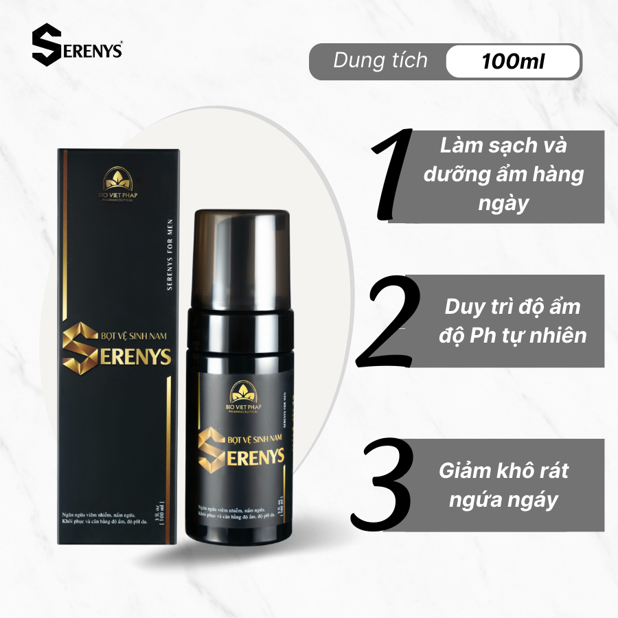 Mua tại TiktokSerenys dạng bọt 100ml - Khử mùi hôi ở nam Ngày nay, nam giới rất quan tâm đến việc làm đẹp và bảo vệ sức khỏe của mình. Do đó, trên thị trường cho ra rất nhiều sản phẩm dành riêng cho nam giới như sữa rửa mặt, dầu gội đầu, sữa tắm, nước hoa, lăn khử mùi, dung dịch vệ sinh… Nắm bắt các nhu cầu đó, Công ty Bio Việt Pháp tiếp tục sản xuất thêm sản phẩm Khử mùi hôi ở nam sau sự thành công của dung dịch vệ Serenys Classic và đang được mọi người đón nhận tích cực. CÔNG DỤNG DỊCH VỆ SINH NAM SERENYS DẠNG BỌT 100ML: