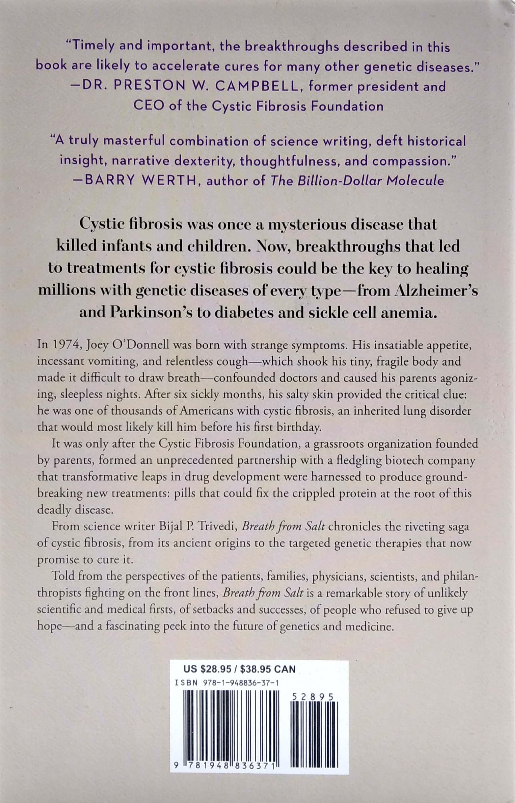 From science writer Bijal P. Trivedi, Breath from Salt chronicles the riveting saga of cystic fibrosis, from its ancient origins to its identification in the dank autopsy room of a hospital basement, and from the CF gene's celebrated status as one of the first human disease genes ever discovered to the groundbreaking targeted genetic therapies that now promise to cure it.