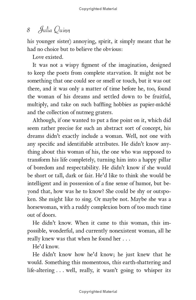 Unlike most men of his acquaintance, Gregory Bridgerton believes in true love. And he is convinced that when he finds the woman of his dreams, he will know in an instant that she is the one. And that is exactly what happened. Except