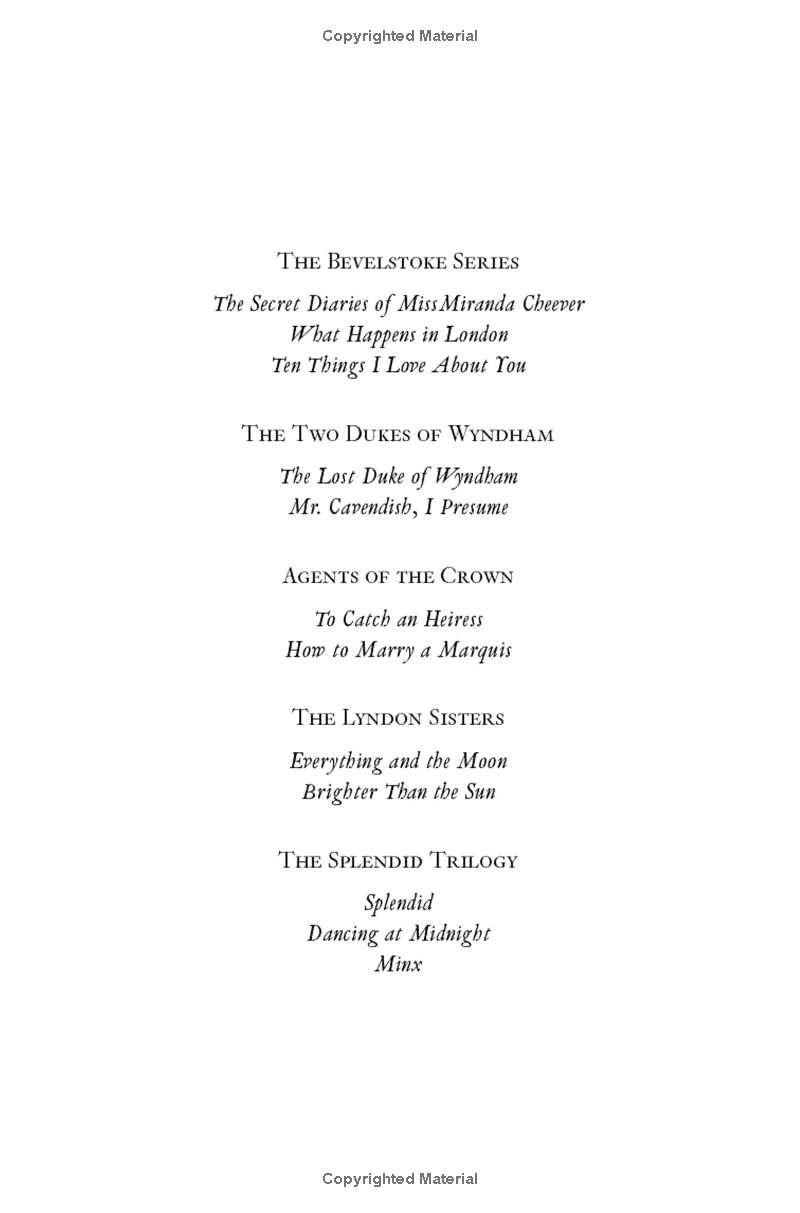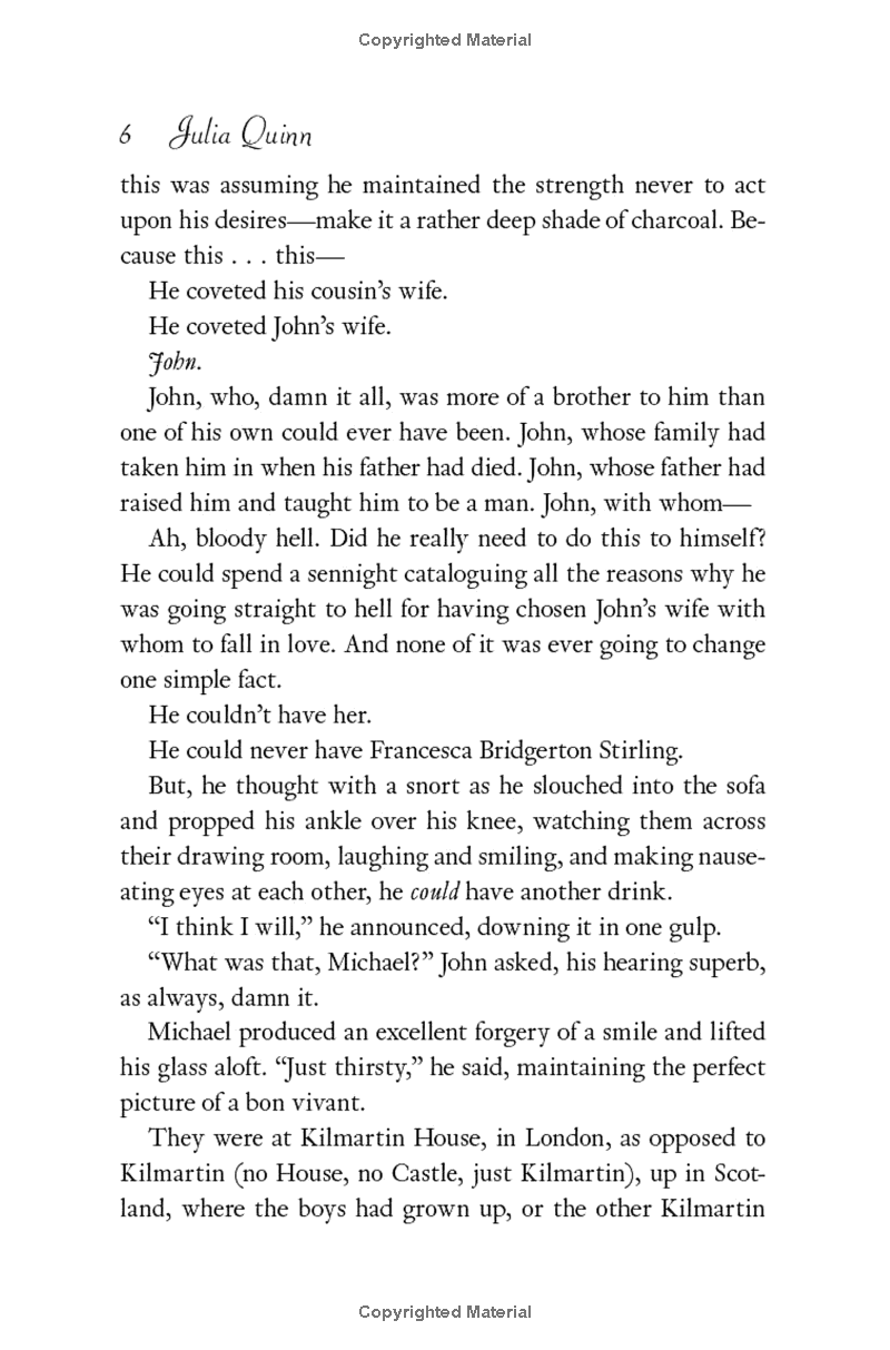 After a lifetime of chasing women, of smiling slyly as they chased him, of allowing himself to be caught but never permitting his heart to become engaged, he took one look at Francesca Bridgerton and fell so fast and hard into love it was a wonder he managed to remain standing. Unfortunately for Michael, however, Francesca’s surname was to remain Bridgerton for only a mere thirty-six hours longer—the occasion of their meeting was, lamentably, a supper celebrating her imminent wedding to his cousin.