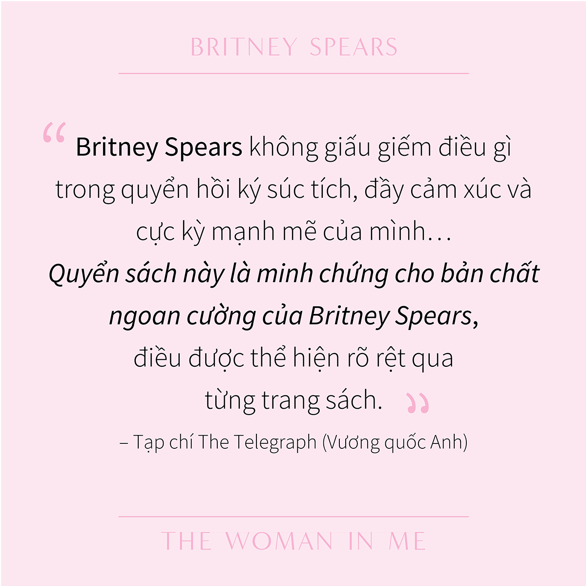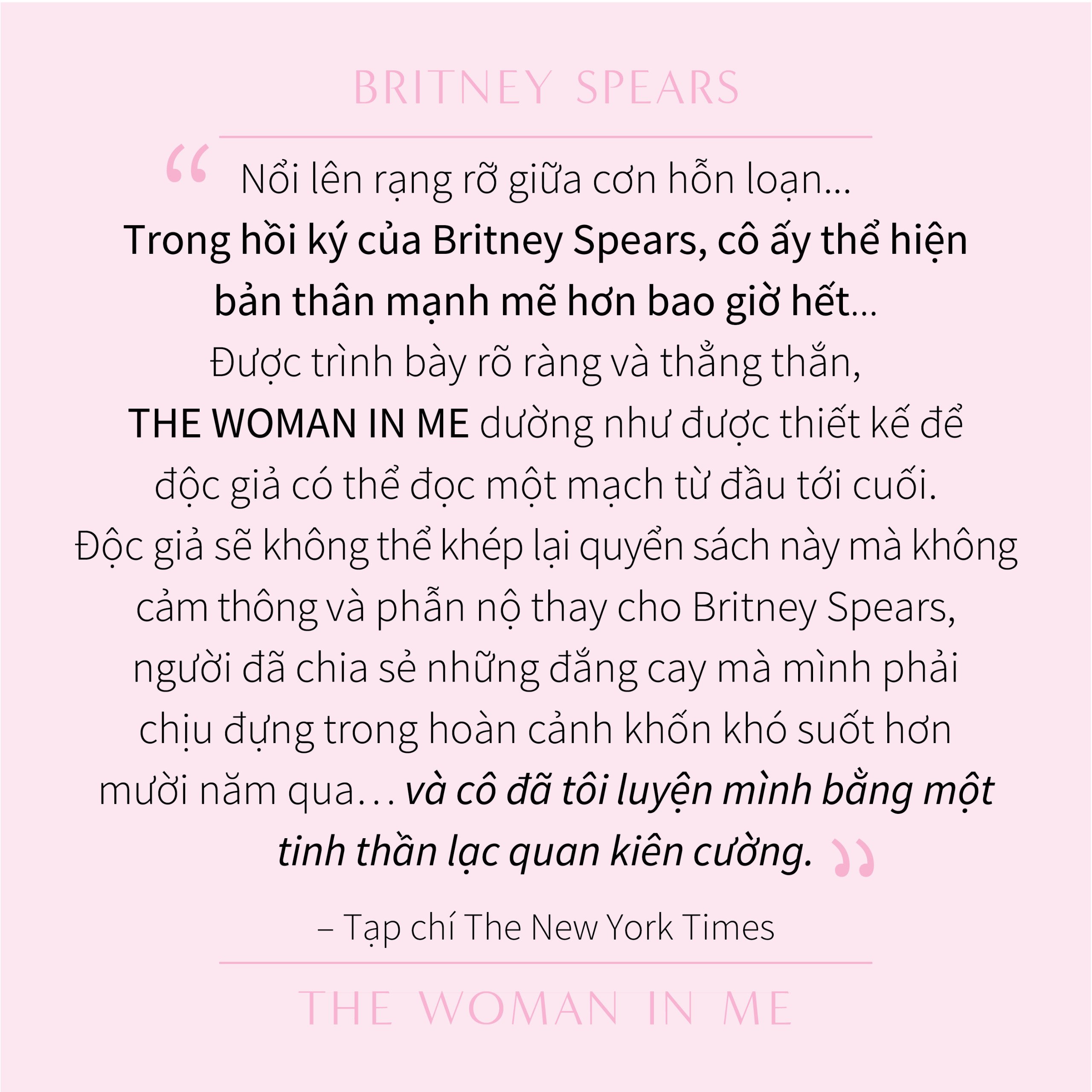 Người đàn bà trong tôi hé mở cho độc giả thấy hành trình phi thường của Britney Spears, cùng với sức mạnh cốt lõi của cô ấy, một trong những nghệ sĩ vĩ đại nhất trong lịch sử nhạc pop.
