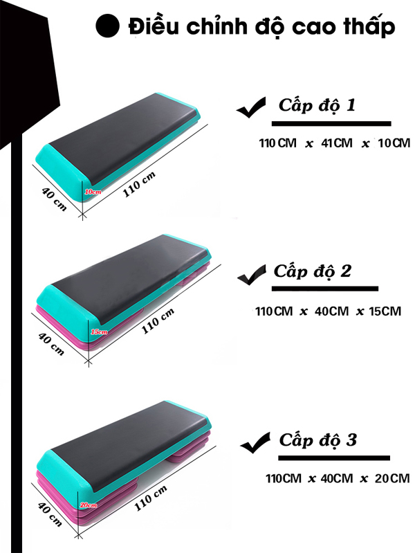 - Cấp độ 3: 110 x 40 x 20cm Kích thước bục dậm nhảy Aerobic 840 - Bục nhảy Aerobic 840 là dùng cho các bài tập thể dục thẩm mỹ, Aerobic và đặc biệt là các bài tập chân. Tập luyện các bài tập Aerobic không chỉ có tác dụng giảm béo mà còn hoàn thiện về vóc dáng. Đây cũng là một bài tập mang tính giải trí cao sau những giờ lao động mệt nhọc.