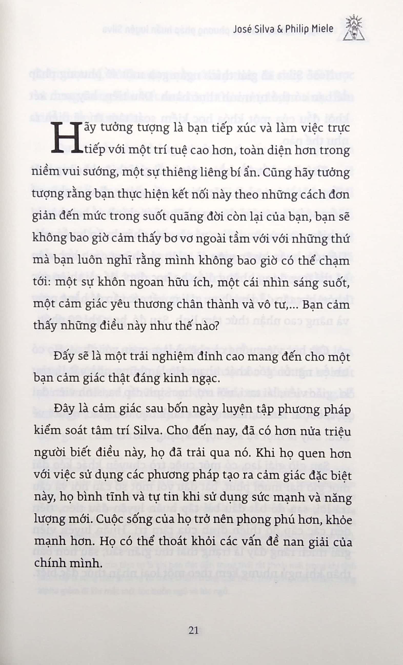Phương pháp kiểm soát Tâm trí Silva dạy bạn sử dụng tâm trí tốt hơn và suy nghĩ hiệu quả hơn, đồng thời kích hoạt các vùng não hầu như không hoạt động. Thông qua các bài tập đơn giản, bạn có thể kích thích trí nhở và trực giác, học tốc hành và ngủ sáng tạo, giải quyết các vấn đề lớn nhỏ của cuộc sống hằng ngày. Bạn có thể khám phá cách làm phong phú cuộc sống của chính mình trong mọi lĩnh vực, với các kĩ thuật cho phép bạn: