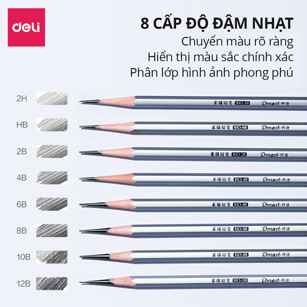 Dòng sản phẩm Bút chì cao cấp Dmast Deli bao gồm 12 độ đậm khác nhau : 2H, HB, 2B, 4B, 6B, 8B,10B, 12B