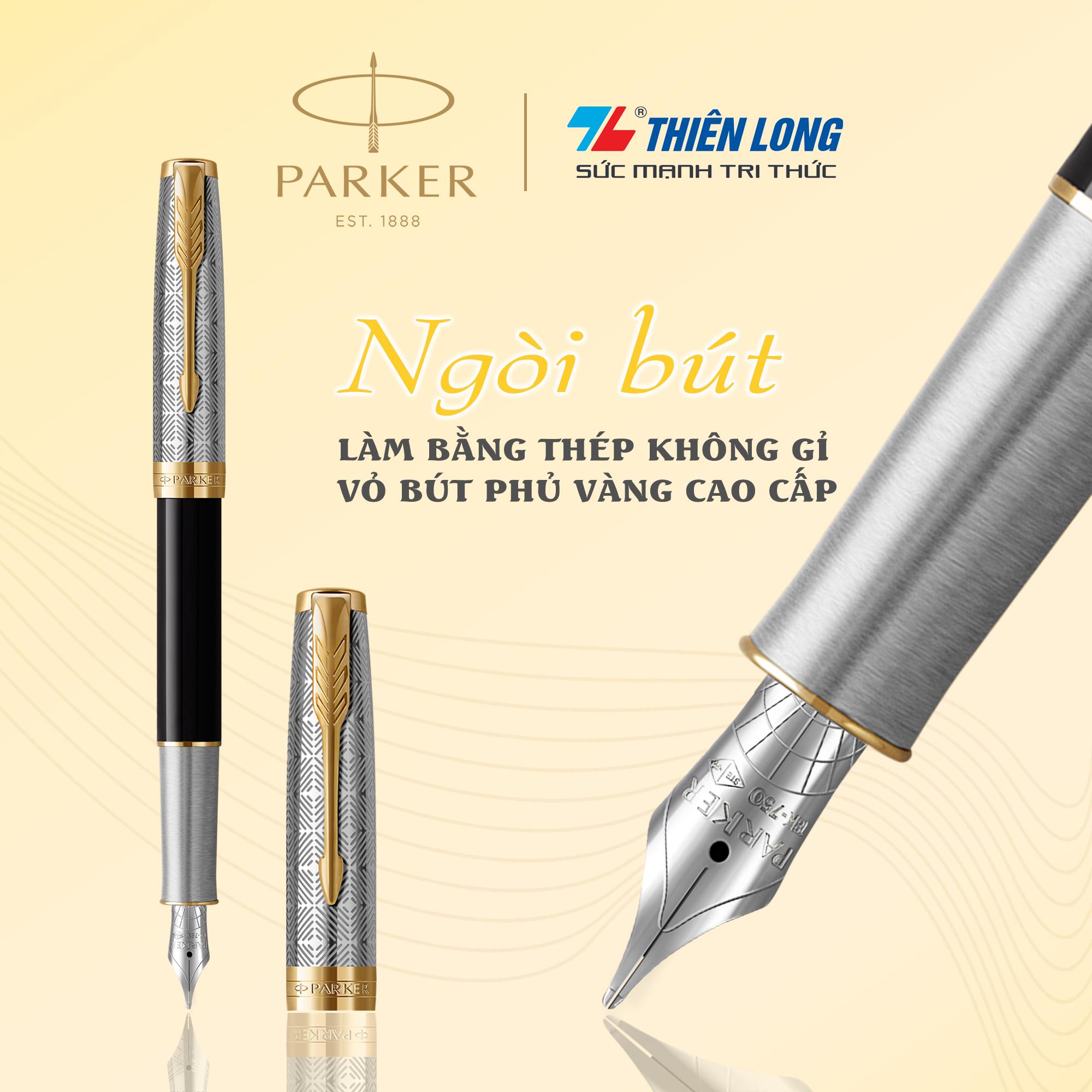 Thông số kĩ thuật : Tên danh mục Bút máy cao cấp Thương hiệu Parker Ngòi bút Fine Màu mực Xanh Chất liệu Thép không gỉ và Mạ vàng 18K Trọng lượng 280 gram Kích