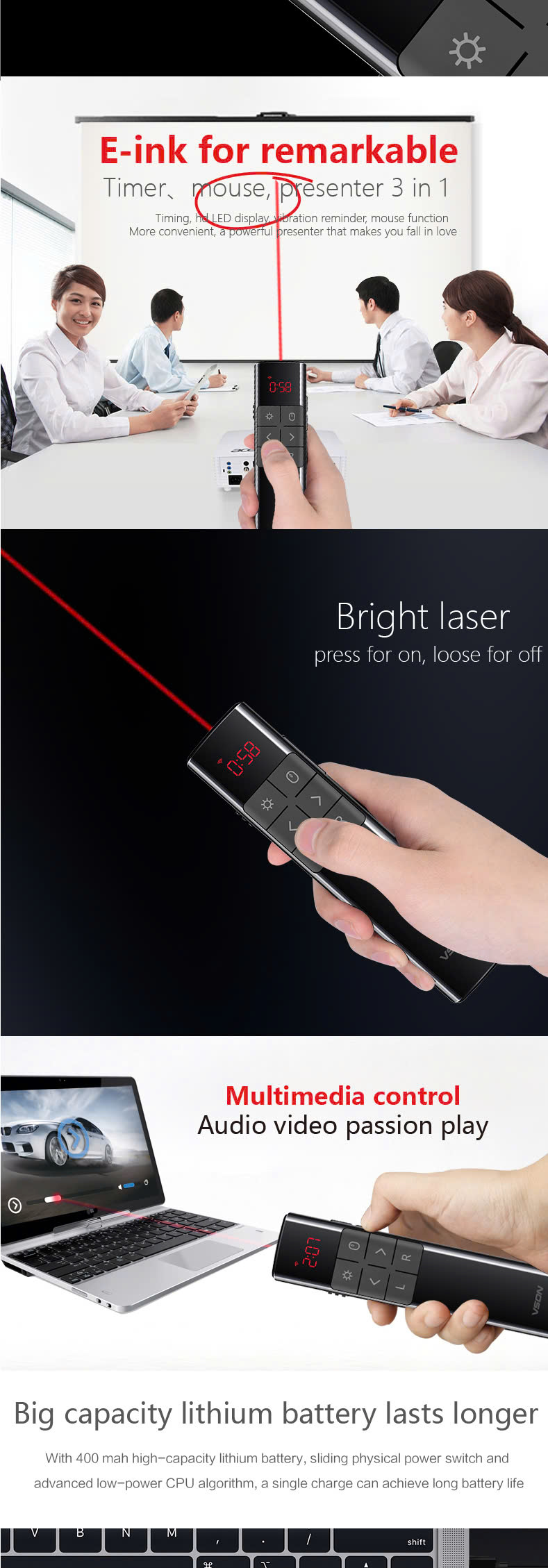 1. Tính năng: sử dụng trình chiếu, thuyết trình, word, PowerP 2. Led: màu đỏ 3. Sử dụng: Pin AAA 4. Khoảng cách chiếu Led: 100-200M 5. Khoảng cách điều khiển: sóng 2.4Ghz lên đến