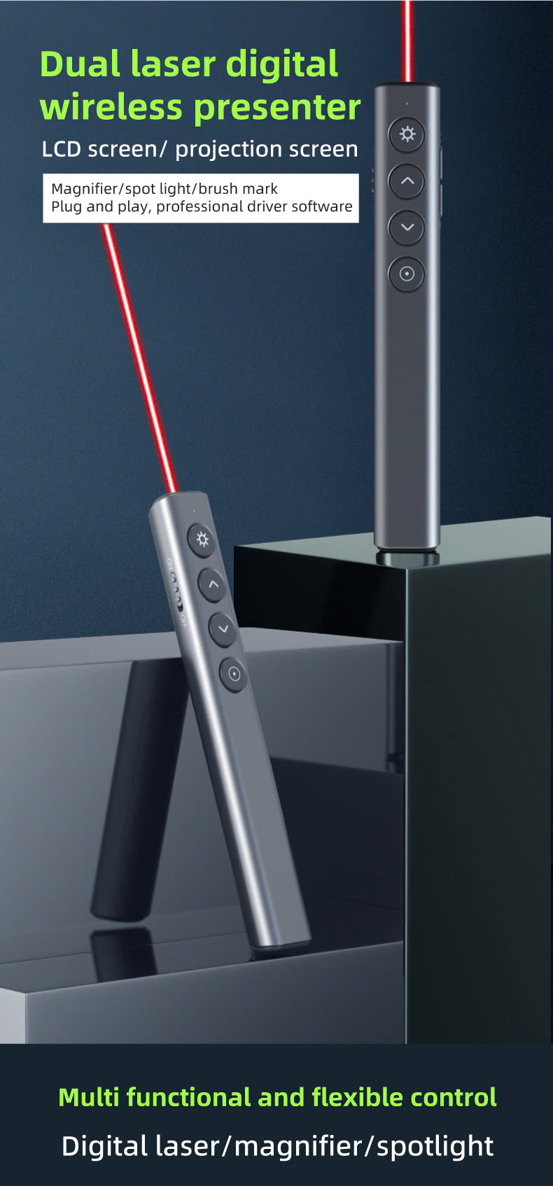 Laser xanh: Người dẫn chương trình không dây với tia laser màu xanh lá cây hiển thị tốt hơn trên nhiều nền khác nhau, ánh sáng xanh lục tươi sáng giúp bạn chỉ rõ mọi thứ