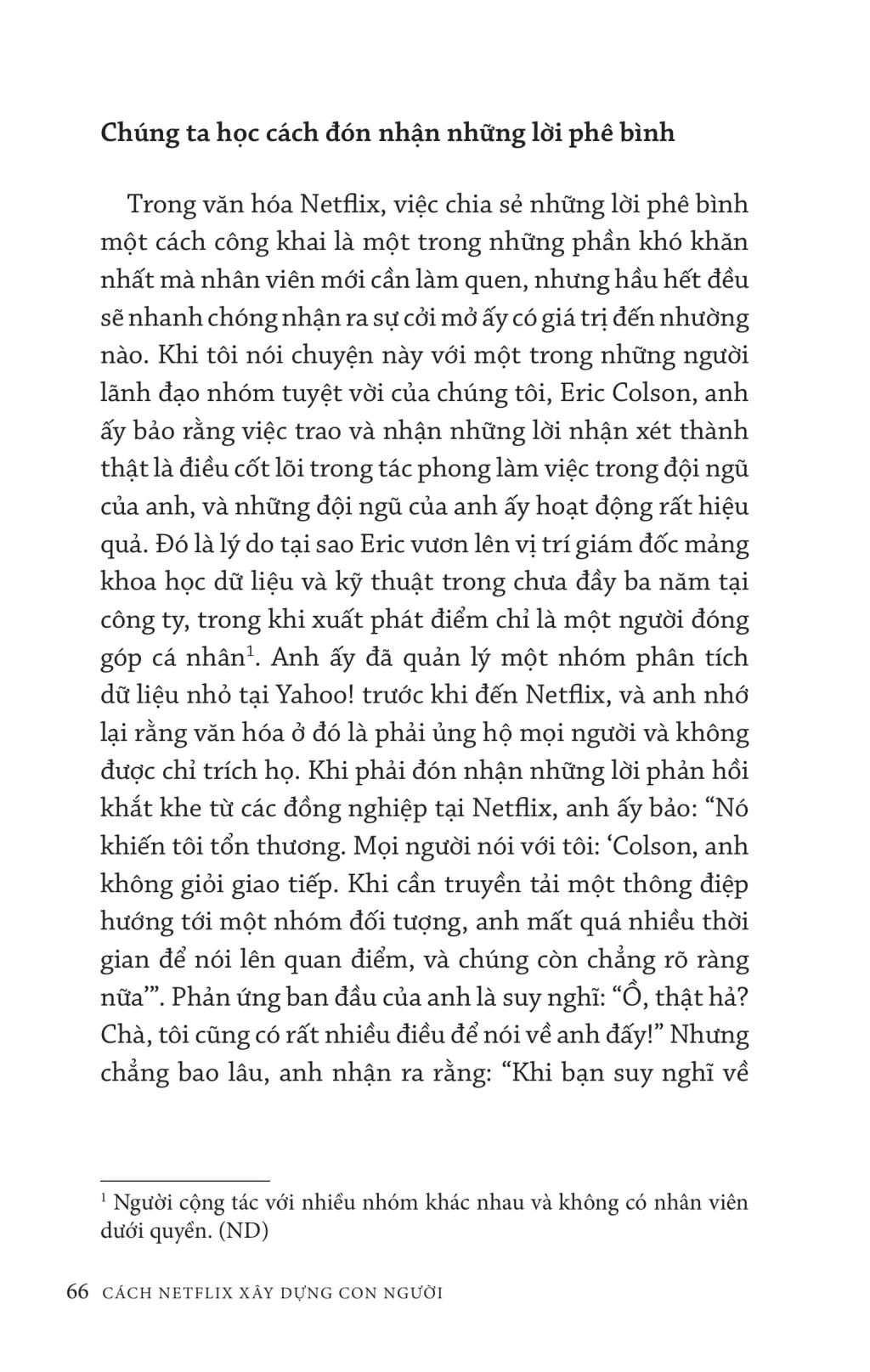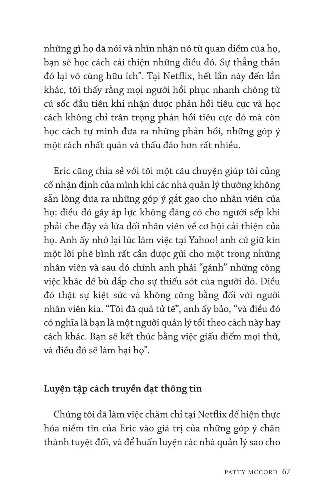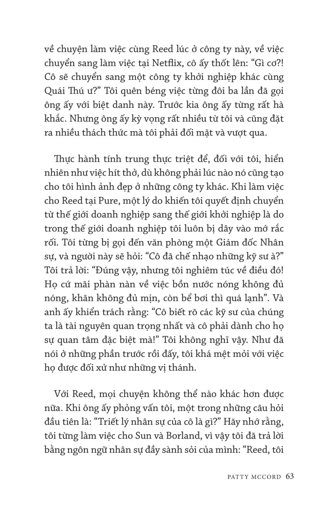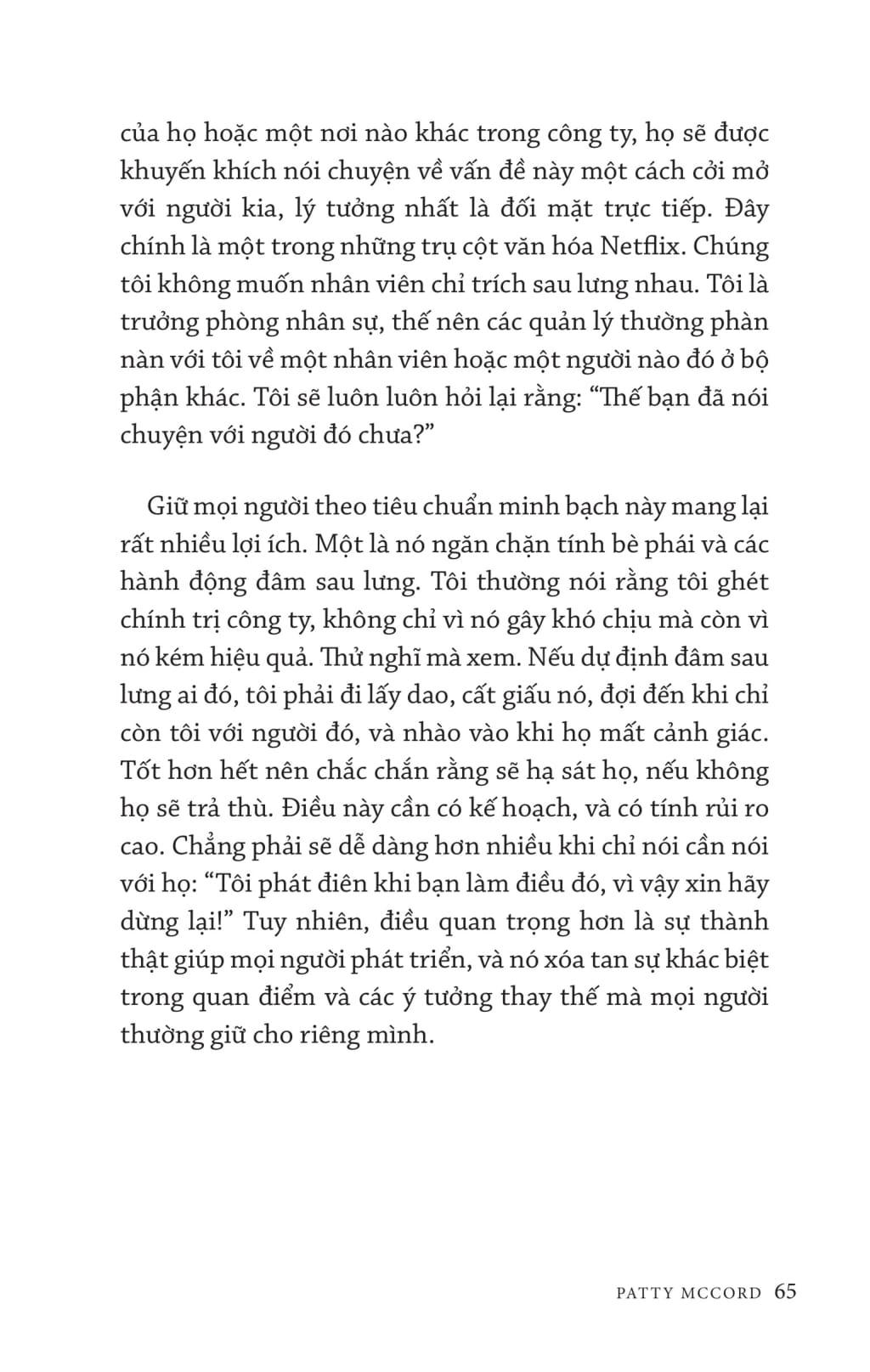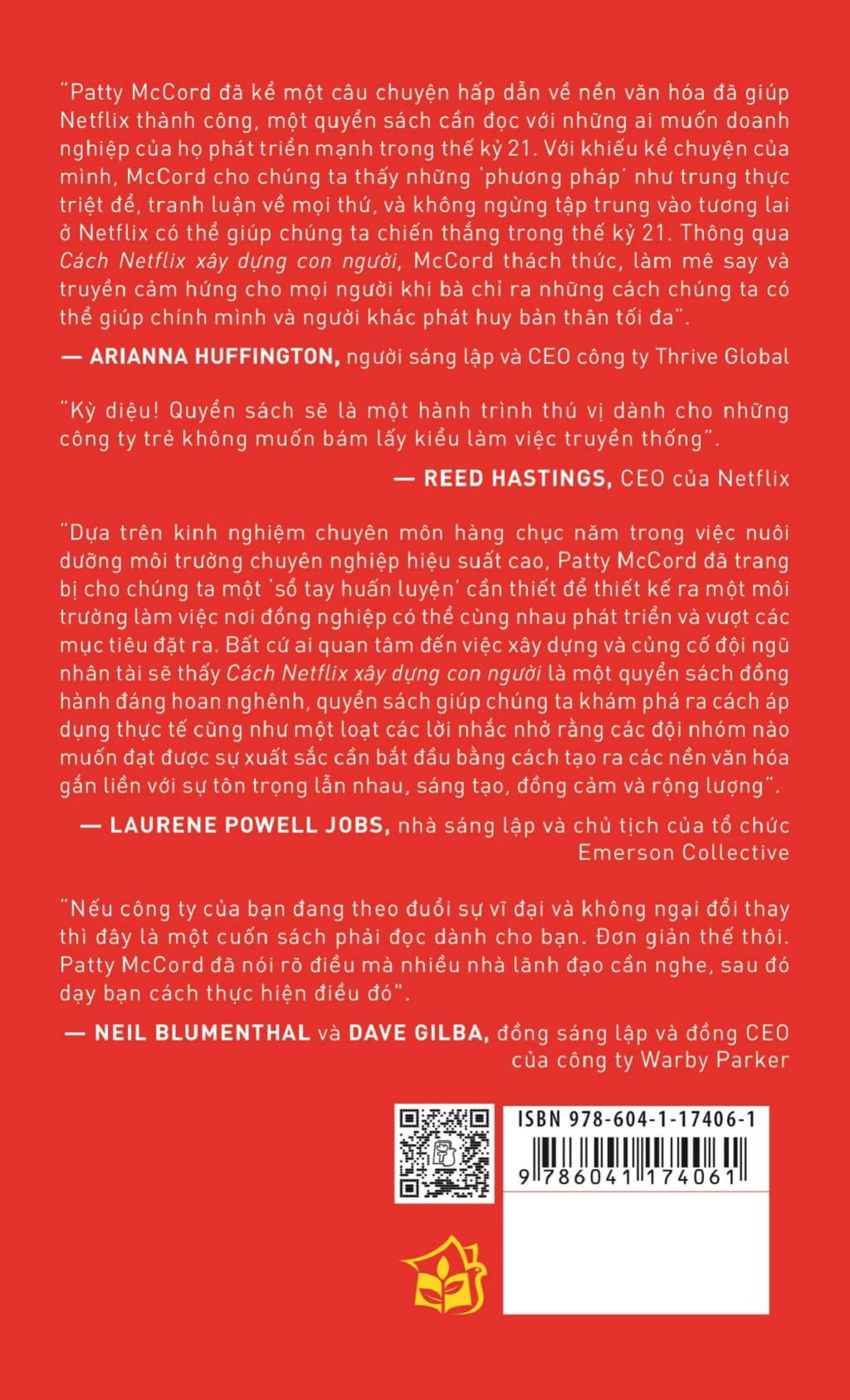 Cách Netflix xây dựng con người bàn về cách xây dựng văn hóa làm việc tại Netflix để tuyển được những nhân viên giỏi giang, đồng lòng dù phải đối mặt với sự cạnh tranh khốc liệt. Mở đầu, tác giả Patty McCord - Cựu giám đốc nhân sự Netflix - giới thiệu cách tiếp cận kiểu làm việc mới: “trói buộc” nhân viên bằng tự do và trách nhiệm. Sau đó tác giả đặt câu hỏi đâu là động lực to lớn nhất của nhân viên và phải đối đãi với nhân viên như thế nào, trao đổi, cung cấp thông tin cho họ đến đâu. ộc giả sẽ cùng tìm hiểu xem làm thế nào để đề cao tính trung thực triệt để trong môi trường công sở, thúc đẩy sự tranh luận sôi nổi của mọi người và hướng tất cả liên tục tập trung vào tương lai ra sao để đưa doanh nghiệp đi tới thành công. Không chỉ là tìm người phù hợp với từng vị trí, các vấn đề nhạy cảm như lương thưởng cũng như cho thôi việc, chuyển việc cũng được xem xét tới. Đây là một cuốn sách đáng đọc cho những người muốn tìm hiểu về thành công của Netflix cũng như muốn xây dựng được một văn hóa doanh nghiệp phù hợp với tầm nhìn của mình. Làm giám đốc nhân sự tại Netflix trong mười bốn năm, Patty McCord là người giúp tạo ra "Kim chỉ nam văn hóa Netflix" (Netflix Culture Deck). kể từ khi được đăng tải lần đầu tiên trên Internet, "Kim chỉ nam" này đã có hơn 15 triệu lượt xem. Sheryl Sandberg đã cho rằng "đây có thể là tài liệu quan trọng nhất từng 'được mang ra' khỏi thung lũng Silicon". Patty tham gia vào những lần phát hành cổ phiếu ra công chúng của Netflix, và trước đó là tại Pure Atria Software. Bà từng làm việc tại Sun Microsystems, Borland và Seagate Technologies, và hợp tác với nhiều công ty khởi nghiệp nhỏ. Bà từng làm về các mảng nhân sự, đa dạng hóa, truyền thông, và các vị trí nhân sự quốc tế. Hiện tại, Patty huấn luyện và tư vấn cho một nhóm nhỏ các công ty và doanh nhân về văn hóa và nghệ thuật lãnh đạo. Bà cũng đi diễn thuyết cho các đội nhóm trên khắp thế giới.