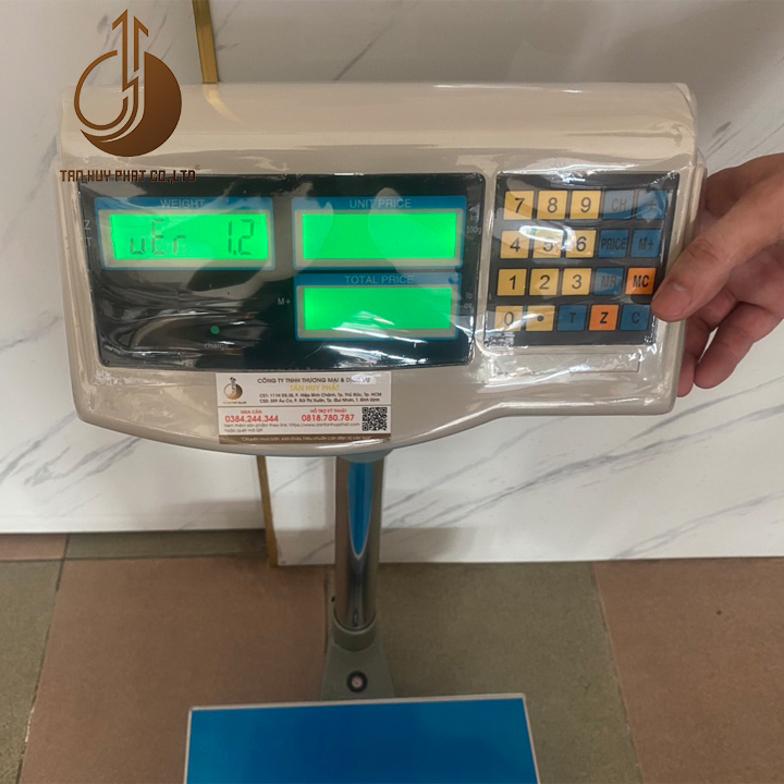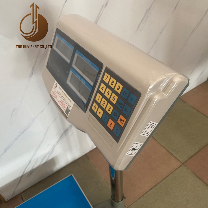 Hiển thị: Màn hình LCD 6 số đen nền xanh. Hiển thị: Khối lượng, Đơn giá, Thành tiền.