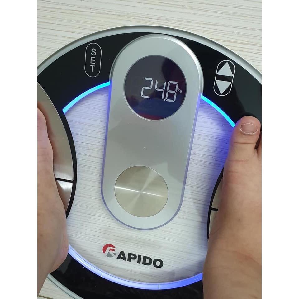 - Cân sức khỏe Rapido sử dụng cảm ứng lực với độ chính xác cao. Có khả năng phân tích được các chỉ số: