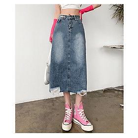 [CAO CẤP] Chân váy jean qua gối rách lai C065 dáng suông wax xanh xám không co dãn
