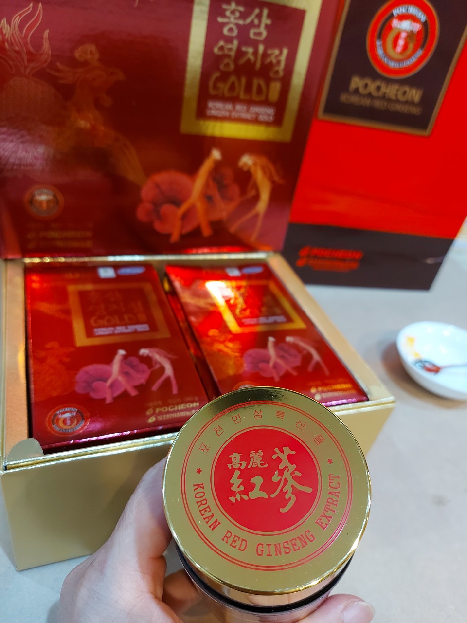 Nguồn gốc xuất xứCao hồng sâm linh chi Pocheon 2 lọ là dòng sản phẩm thuộc phân khúc bình dân của Pocheon ginseng farmer association, Sản phẩm được chế biến từ những củ sâm tươi 6 năm tuổi chất lượng cao kết hợp với linh chi hàn quốc vô cùng bổ dưỡng, dạng cao tiện dụng.