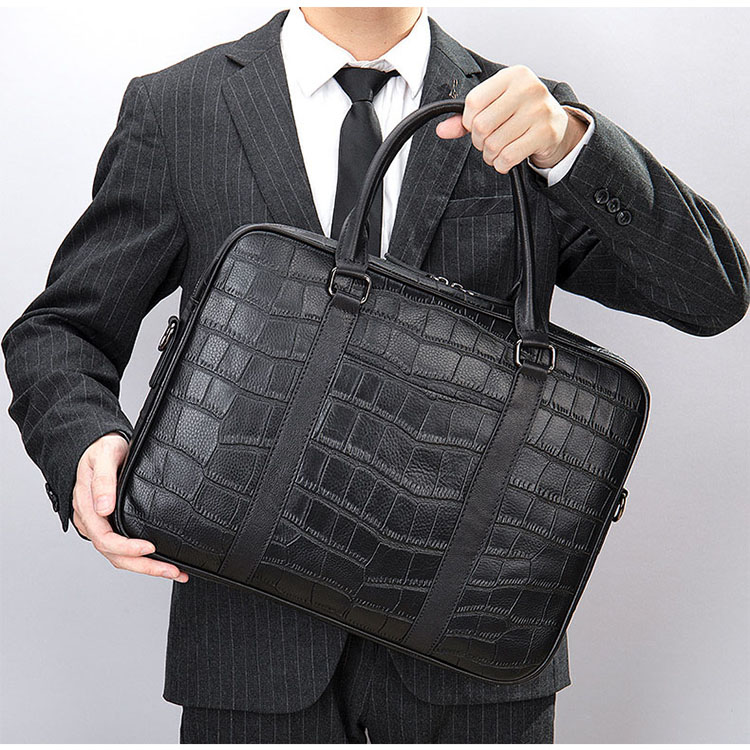Cặp công sở nam da bò dập nổi cao cấp BHM5036 với màu đen lịch lãm, kiểu dáng đơn giản mà vẫn sang khi đeo vai hoặc cầm trên tay.