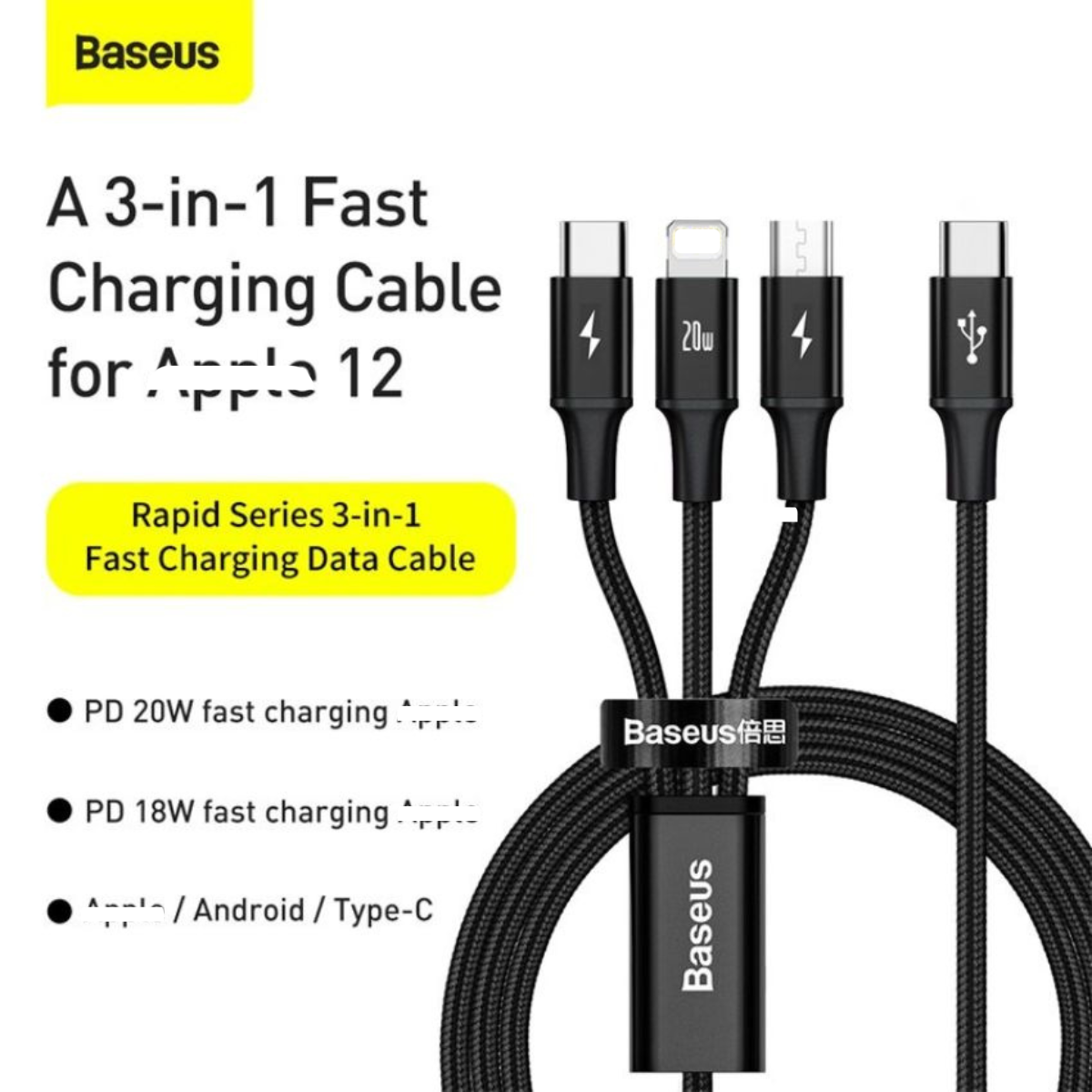 - Cáp sạc 3 đầu CAMLT Baseus Rapid Series 3-in-1 PD 20W hỗ trợ chuẩn sạc nhanh C to Light-ning 20W/18W trên các dòng i-Phone 12/11 và hỗ trợ dòng sạc 3A/2A trên các cổng C và Micro (3A/2A Fast charge) giúp cải thiện đáng kể tốc độ sạc so với các thế hệ cáp sạc 3 in 1 trước đây.