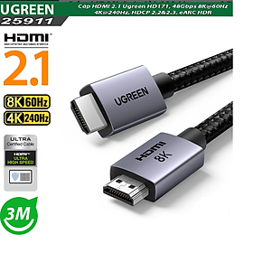 Mua tại Tiktok- Cáp HDMI 2.1 dài 1M Ugreen 25908 HD171 là phụ kiện kết nối màn hình máy chiếu độ phân giải cao hơn, hỗ trợ lên đến 8K@60Hz và 4K@240Hz, cao gấp 4 lần so với 4K@60Hz. Công nghệ tiên tiến giúp cải thiện đáng kể độ rõ nét và sắc nét của hình ảnh.