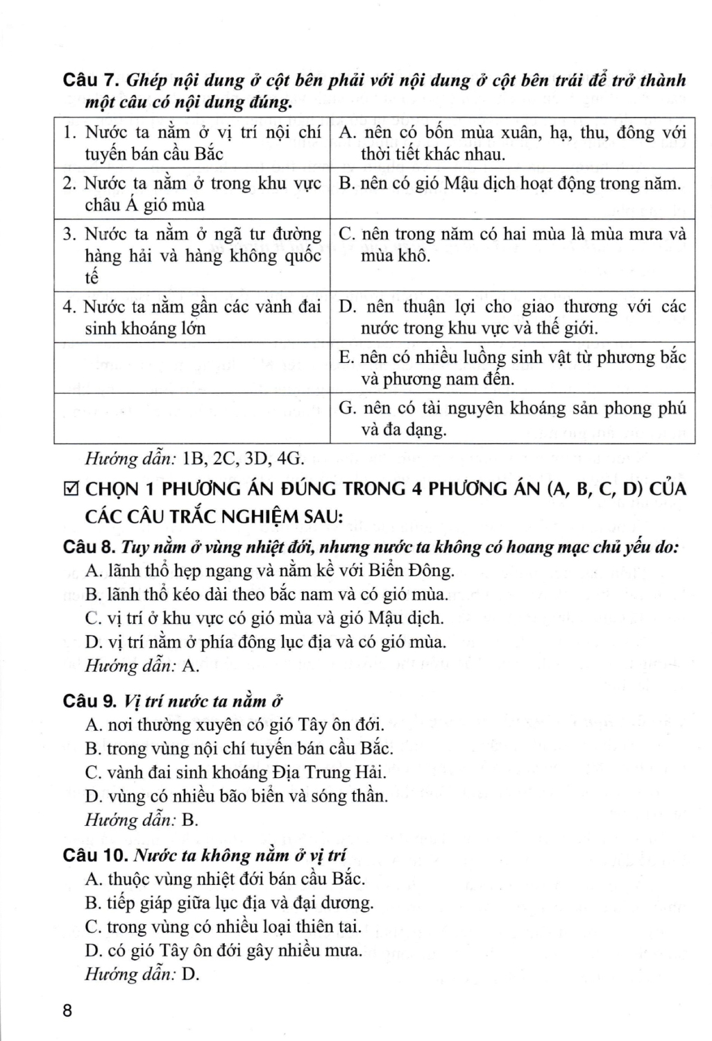 Đặc biệt, sau mỗi câu hỏi và bài tập đều có hướng dẫn thực hiện chi tiết, giúp học sinh dễ dàng tiếp cận và hoàn thành bài tập một cách hiệu quả. Cuốn sách được kỳ vọng sẽ trở thành một công cụ hữu ích cho học sinh trong việc học tập và nâng cao kiến thức Địa lí.