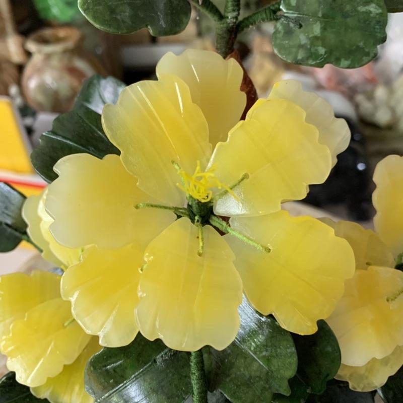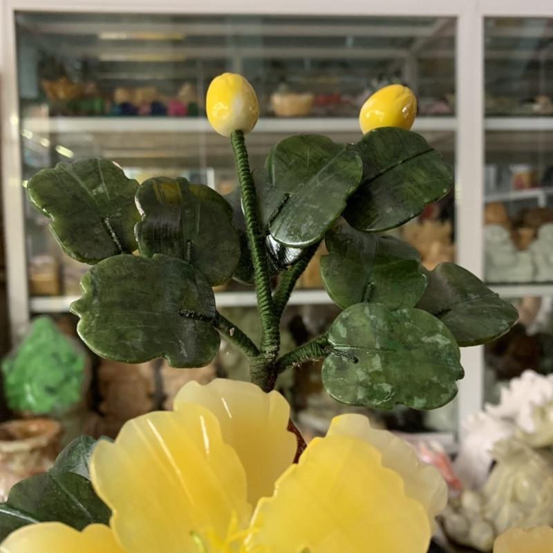 Chất liệu: Hoa đá thạch anh vàng; Lá và chậu là đá ngọc Ấn Độ