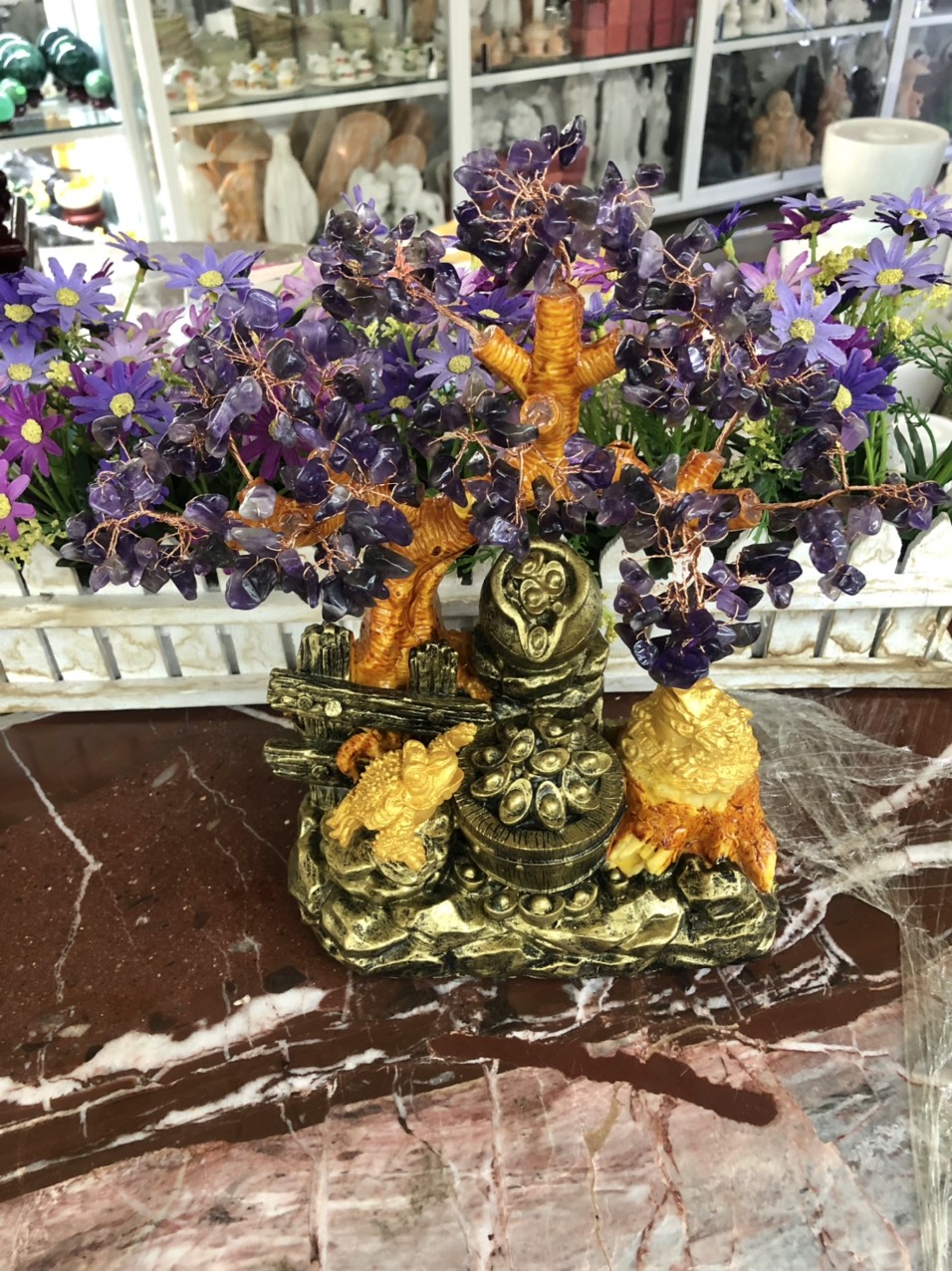 Hợp mệnh Hỏa - Thổ Chất liệu: Đá thạch anh tím Kích thước: Cao 30 cm Khối lượng: 1 kg Cây tài lộc là biểu tượng của sự sung túc, mang đến cát khí mạnh