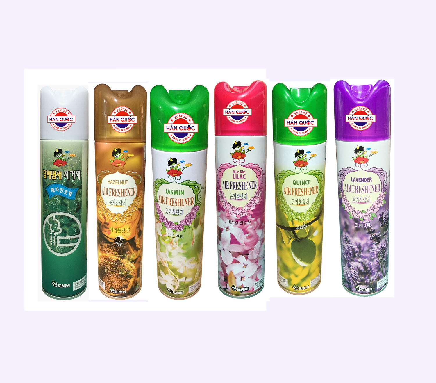 Hương Bạc Hà,Cafe,Lilac.Jasmin,Quince,LavenderCông dụng : Sản phẩm xuất xứ từ Korea dùng để tạo không khí tươi mát, dễ chịu với hương thơm nhẹ nhàng, dễ bay hơi, không thấm sâu vào đồ vật trong phòng, xe hơi…Thành phần : Chiết xuất từ tinh dầu hoa quả từ thiên nhiên Mùi hương : Bạc hà.Quy cách : Bình dạng xịtKích thước bình : D 5 x R 5 x C 22,5 CmThể tích : 370mlTrọng lượng : 350gHãng sản xuất : Sandokkaebi Xuất xứ : Hàn Quốc
