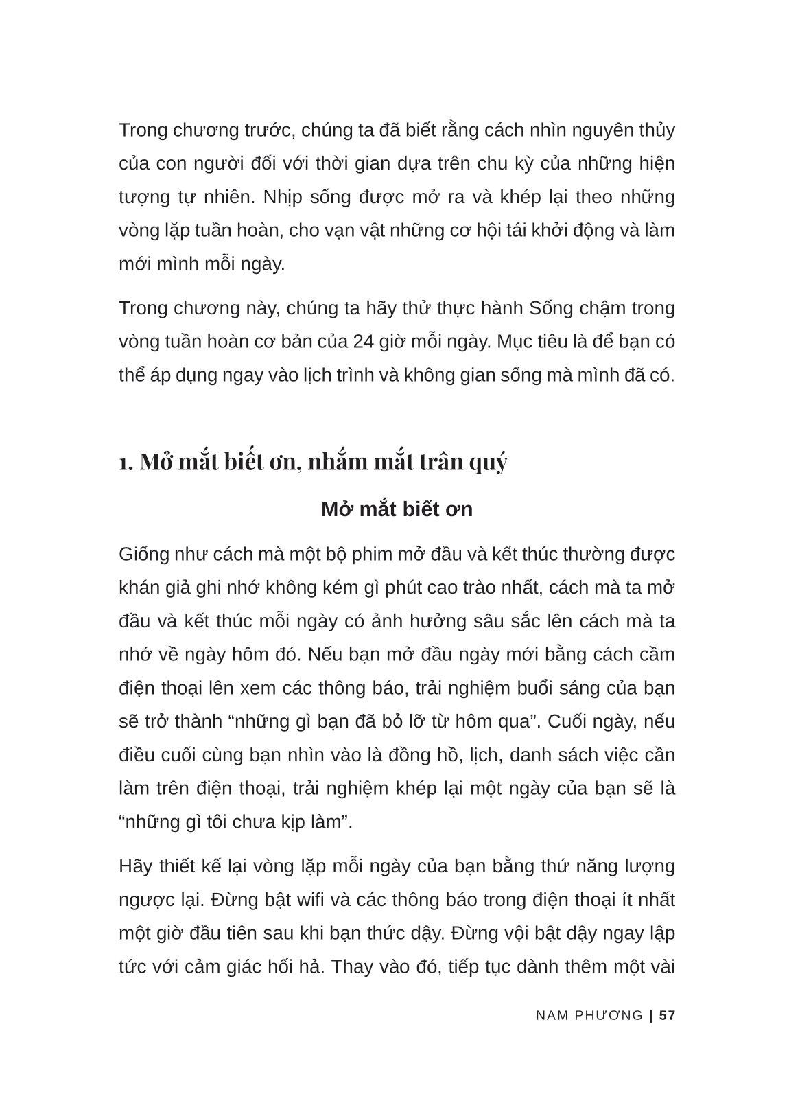 Đây là một cuốn sách toàn diện về thực hành sống chậm, bao gồm những câu chuyện về những con người sống chậm thực thụ, cùng các phương pháp hiệu quả và gây hứng thú đã được chứng minh qua chính các trải nghiệm của những người mà tác giả đã từng khai vấn và giảng dạy. Cuốn sách này sẽ giúp ta học lại cách sống sao cho thong thả, tỉnh thức và chân thật hơn với trái tim m.ình, học cách điều khiển nhịp nhàng dòng chảy cuộc sống, lui về hàm dưỡng lại thân tâm để ngày càng mở rộng sức dung chứa với cuộc đời, đạt được sự sáng rõ về điều mà trái tim m.ình thực sự khao khát, và rồi nhận ra bên cạnh việc hướng tầm nhìn về tương lai, ta luôn có thể đón nhận những gì đang sẵn có ở hiện tại.