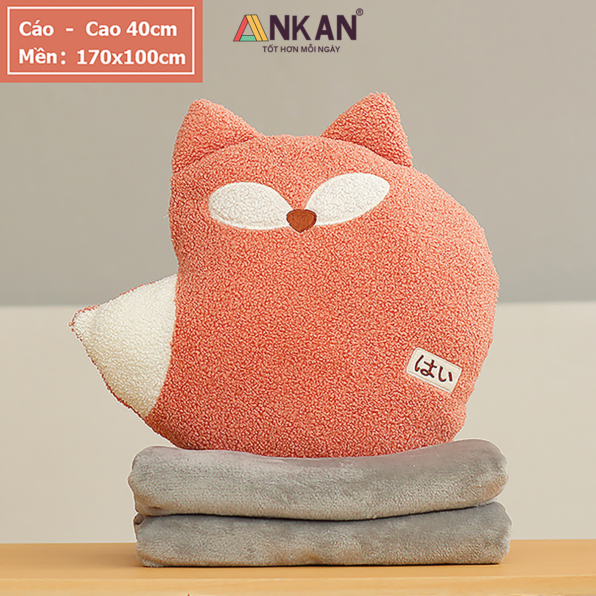 Bộ Chăn Gối Văn Phòng Đa Năng Hình Thú Gấu Bông Dễ Thương, Tiện Lợi Cho Bé Đi Học Và Du Lịch        CHĂN GỐI VĂN PHÒNG ANKAN CÓ GÌ ĐẶC BIỆT    Thiết kế hình thú xinh xắn, phù hợp làm quà sinh nhật, quà tặng bạn bè, người yêu, đồng nghiệp.  Đa năng 3 trong 1: vừa là gối ôm – gối tựa lưng – gối luồn tay, kèm chăn êm giữ ấm.  Sử dụng tiện lợi cho nhiều mục đích: ngủ trưa văn phòng, đi học, đi làm, du lịch. Trên sản phẩm có nhãn chữ “はい” (hai) – nghĩa là “Vâng” trong tiếng Việt, mang đến cảm giác dễ thương, tích cực và gần gũi theo phong cách Nhật Bản.        CAM KẾT TỪ ANKAN    Sản phẩm đúng mô tả, đúng mẫu, đúng kích thước.  Đổi trả trong 15 ngày nếu khách không hài lòng.  Hoàn tiền 100% nếu sản phẩm lỗi do nhà sản xuất.  Đóng gói sạch sẽ, an toàn, giao hàng nhanh chóng.        THÔNG SỐ KỸ THUẬT  Kích thước gối: 40 x 35 cm.  Kích thước chăn: 100 x 170 cm (được lồng gọn trong gối).  Chất liệu vỏ: vải nhung siêu mềm.  Chất liệu ruột: bông PP cao cấp, an toàn cho da.  Trọng lượng: khoảng 800g.  Có 4 kiểu dáng để bạn lựa chọn là Cáo Đỏ, Cá Voi Xanh, Cừu Trắng và Gấu Nhật Bản        ƯU ĐIỂM NỔI BẬT    Vải nhung mềm mịn, thoáng khí, dễ giặt sạch.