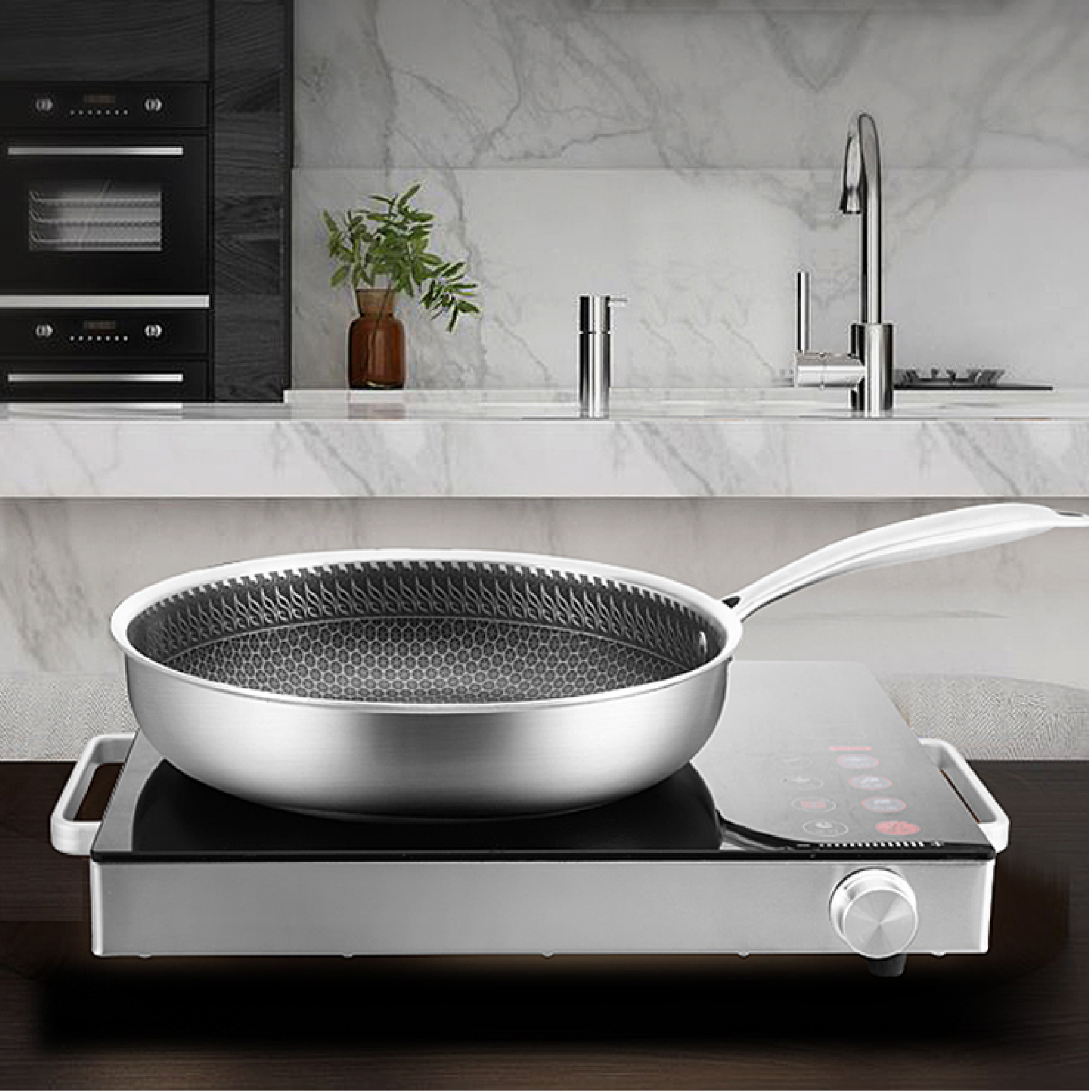 Chảo Inox 3 lớp nguyên khối Ruby sở hữu thiết kế sang trọng, chuẩn Châu Âu với chất liệu inox sáng bóng bên ngoài. Lòng chảo phủ chống dính honeycomb đen bóng bền bỉ với