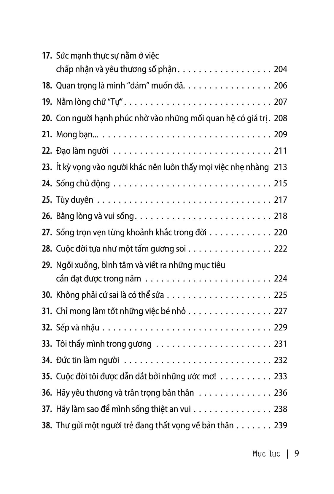 Quyển sách gồm 4 phần chính: Chiêm nghiệm để thấu đời, hiểu người và ngẫm lại chính m.ình (Ngẫm); Học hỏi người đi trước và rút ra những bài học sâu sắc trên đường đời (Học người); Trui rèn bản thân khi đã “ngẫm” và “học”, không phải để ganh đua, mà để trở thành phiên bản tốt nhất của chính m.ình. Và rồi, ta càng nỗ lực hơn để hoàn thiện bản thân, cuộc đời càng tha thiết yêu ta như cách ta trân trọng từng khoảnh khắc, từng hạnh phúc nhỏ nhặt của cuộc sống. (Cảm)
