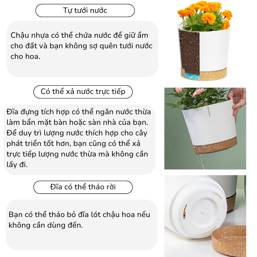 Chậu trồng cây tự tưới nước: Có 3 lỗ thoát nước để tưới nước và đơn giản hóa việc chăm sóc cây, giúp bạn dễ dàng tưới nước cho cây và tránh tắc nghẽn, thiết