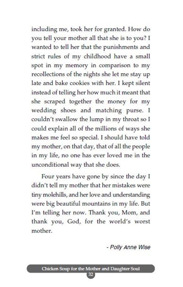 Làm mẹ không đơn thuần là một vai trò hay là kết quả tất yếu về mặt sinh học. Người làm mẹ không chỉ là người sinh ra và dưỡng dục những đứa con mà trách nhiệm cao cả của người mẹ ở việc dạy dỗ những đứa con gái bé bỏng của m.ình học cách yêu thương, học cách suy nghĩ sao cho quen với vai trò của một người phụ nữ. Làm mẹ là phải phục vụ, yêu thương, cảm thông, trân trọng và quan tâm đến các con của m.ình. Còn những cô con gái, họ nghĩ về mẹ của m.ình như thế nào và vai trò của họ đối với mẹ ra sao? Những câu chuyện trong Chicken Soup for the Mother and Daughter Soul sẽ giúp chúng ta hiểu được những giá trị tinh thần lớn lao của những cô con gái. Họ đã đi vào cuộc đời của người mẹ như một món quà quý giá mà tạo hóa đã ban tặng cho người mẹ. Những nụ cười hồn nhiên, những vòng tay yêu thương, quấn quýt của con trẻ có tác dụng nâng đỡ tinh thần, truyền sức mạnh và sưởi ấm tâm hồn những bà mẹ, giúp người mẹ sống tự tin và yêu đời hơn. Con gái còn cho những người mẹ thấy một thế giới rộng lớn hơn - đó là thế giới riêng của chúng, đồng thời giúp người mẹ thấy được chính họ với một cuộc đời mới, để cảm nhận được tình yêu thương của các con. Và trên hết là con cái cũng dành cho mẹ của m.ình tất cả tình yêu thương, sự kính trọng tựa như những gì họ đã nhận được từ mẹ.