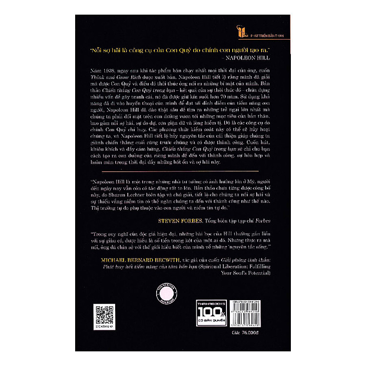 Chiến Thắng Con Quỷ Trong Bạn (Tái Bản 2018)                    Cuốn sách là cuộc trò chuyện của Napoleon Hill và Con Quỷ. Sau bao nhiêu năm miệt mài nghiên cứu cuối cùng ông cũng phát hiện ra Con Quỷ, bắt nó phải thú tội và tiết lộ những sự thật kinh hoàng về nơi nó sống, cách nó kiểm soát tâm trí con người và cách để con người chiến thắng được nó. Khi đọc cuốn sách này, có thể bạn sẽ tự hỏi, cuộc trò chuyện này có thật không? Con Quỷ là có thật hay là một sản phẩm của trí tưởng tượng của Napoleon Hill. Nhưng quyền lựa chọn cách hiểu vấn đề là của bạn. Bởi lẽ cuối cùng, thông qua cuộc trò chuyện với Con Quỷ, Napoleon Hill đã cung cấp cho chúng ta chìa khóa để chiến thắng Con Quỷ trong cuộc sống riêng của mỗi người. Hãy tận hưởng cuốn sách kỳ diệu này và chia sẻ nó với gia đình, bạn bè. Sức mạnh trong ngôn từ của Napoleon Hill có thể và sẽ thay đổi cuộc đời bạn.