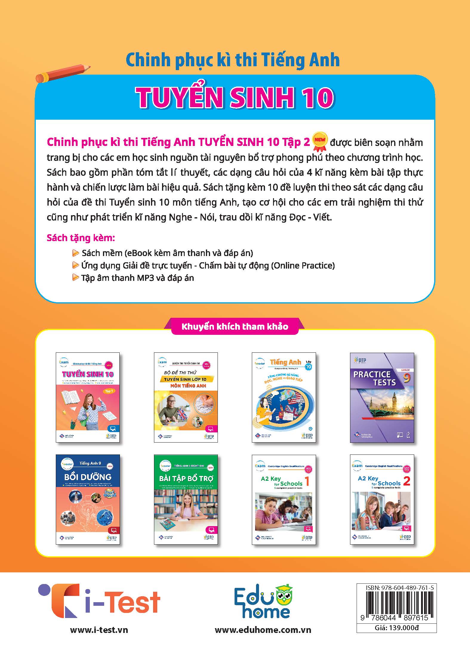 Mua tại TiktokChinh phục kì thi Tiếng Anh - Tuyển sinh 10 tập 2 được biên soạn nhằm trang bị cho các em học sinh nguồn tài nguyên bổ trợ phong phú theo chương trình học và giúp các em chuẩn bị tốt nhất cho kì thi tuyển sinh lớp 10 môn tiếng Anh. Sách bao gồm phần tóm tắt lý thuyết và bài tập thực hành được thiết kế bám sát các dạng câu hỏi trong đề thi tuyển sinh lớp 10, tạo cơ hội cho các em làm quen với các định dạng đề thi cũng như củng cố kiến thức từ vựng, ngữ pháp, phát âm và thực hành các chiến lược làm bài một cách hiệu quả.