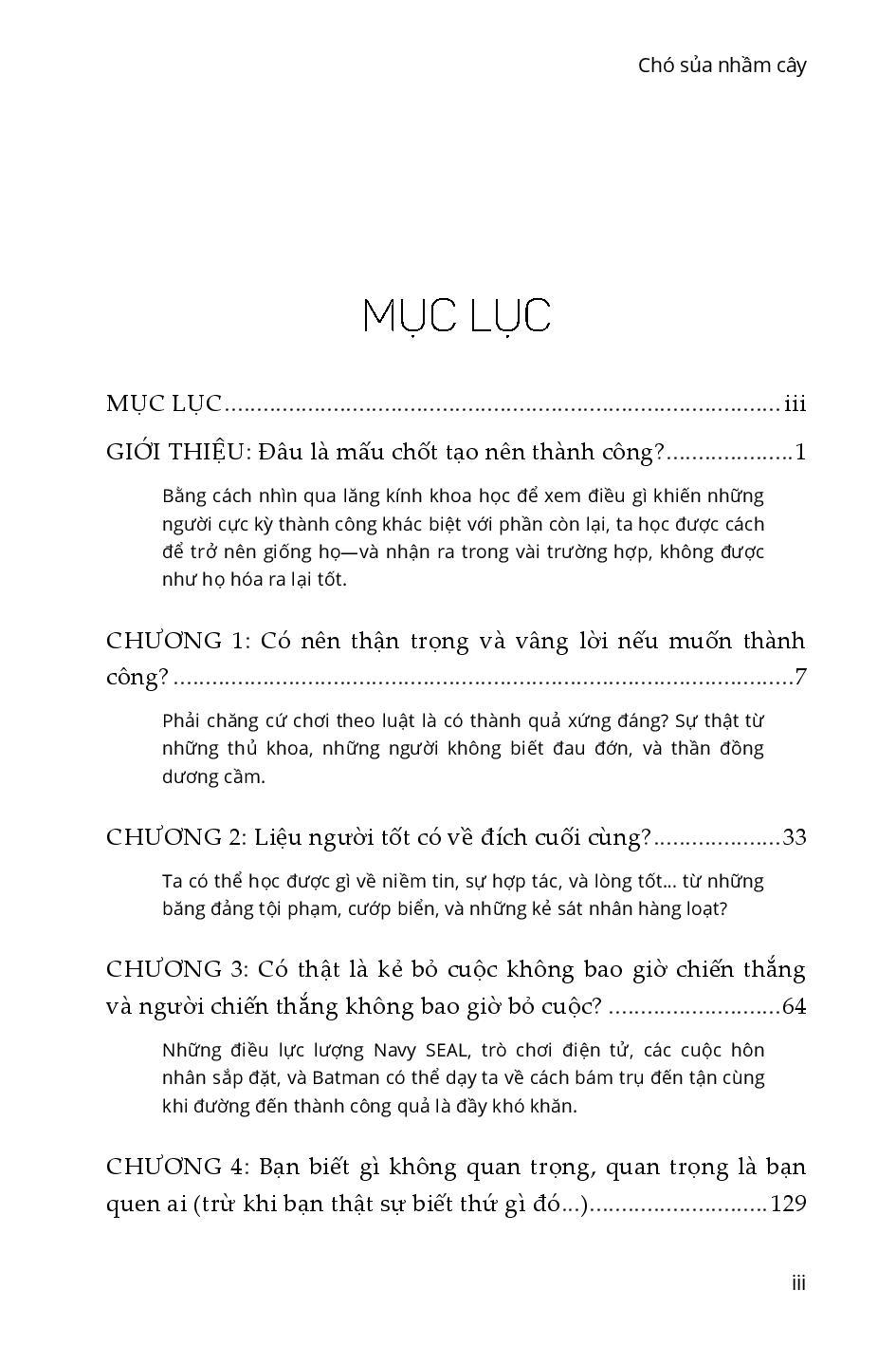 - Những người lính Navy SEAL và những nhân viên bán bảo hiểm có một điểm chung quan trọng, và cách sử dụng nguyên tắc WNGF trong thiết kế trò chơi để biến đống bài tập chán ngắt thành những trò chơi hấp dẫn. Rất nhiều lời khuyên về thành công rất logic, đầy cảm hứng, và sai bét. Bằng cách nhìn qua lăng kính khoa học để xem những người cực kỳ thành công khác với m.ình ở những điểm nào, ta học được cách để trở nên giống họ—và nhận ra trong vài trường hợp, không được như họ hóa ra lại tốt hơn. CHÓ SỦA NHẦM CÂY - BARKING UP THE WRONG TREE - là quyển sách gây tiếng vang, liên tục nằm trong danh sách bestseller Amazon của tác giả kiêm chủ trang blog Barking up the wrong tree - Eric Barker. Xuyên suốt nội dung sách, Eric sẽ cùng chúng ta lý giải một cách đầy hóm hỉnh nhưng không kém phần chặt chẽ những quan niệm khác nhau về thành công từ trước đến nay. Và ở cuối con đường đó, mỗi người chúng ta sẽ tự tìm thấy ngưỡng cửa thành công cho riêng m.ình.